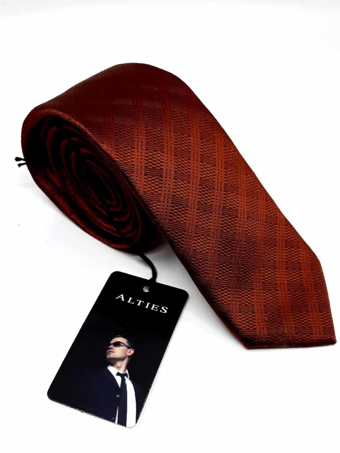 Elegancki krawat męski firmy Alties o klasycznym i modnym kroju w kolorze miedzianego brązu w tłoczoną kratkę.Krawat o klasycznym i modnym kroju, wykonany z microfibry. Jest on bardzo ważnym elementem ubioru, dzięki któremu każdy mężczyzna może wnieść do swojego stroju odrobinę koloru. Kompletując garderobę należy pamiętać, aby krawat tworzył spójny zestaw z marynarką lub koszulą. Jego unikatowy wzór z pewnością spełni swoją funkcję w połączeniu z różnymi tkaninami w kilku wariantach kolorystycznych. Ponadto wyraźne i mocne akcenty zdobnicze dodadzą charakteru i pozwolą wyróżnić się stylem. Krawat można dobrać zarówno do karnacji, garnituru jak i temperamentu.