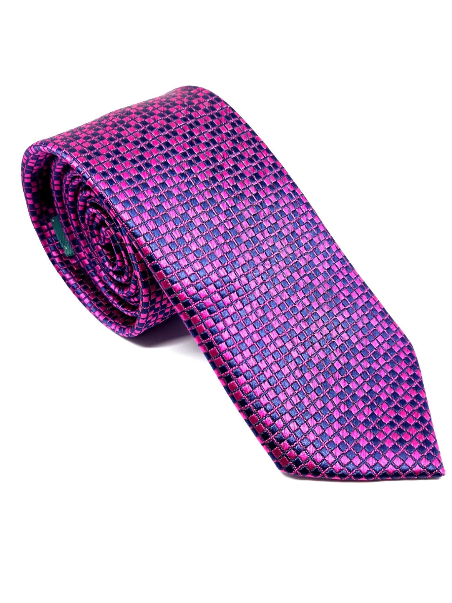Elegancki krawat męski firmy Piotr o klasycznym i modnym kroju, różowy w granatowe kwadraciki.