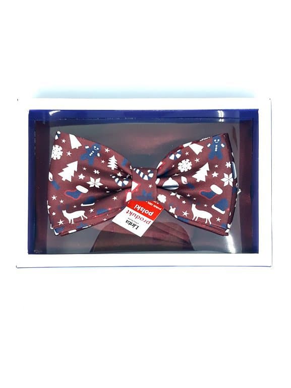 Unikatowa mucha męska świąteczna w kolorze bordowym we wzorki wraz z poszetką.