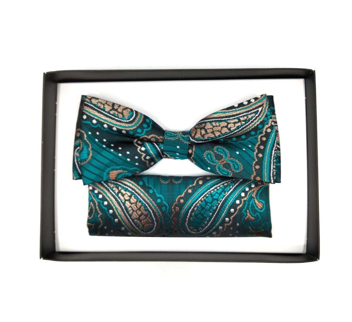 Unikatowa mucha w zestawie z poszetką zielona w brazowo białe wzory.
