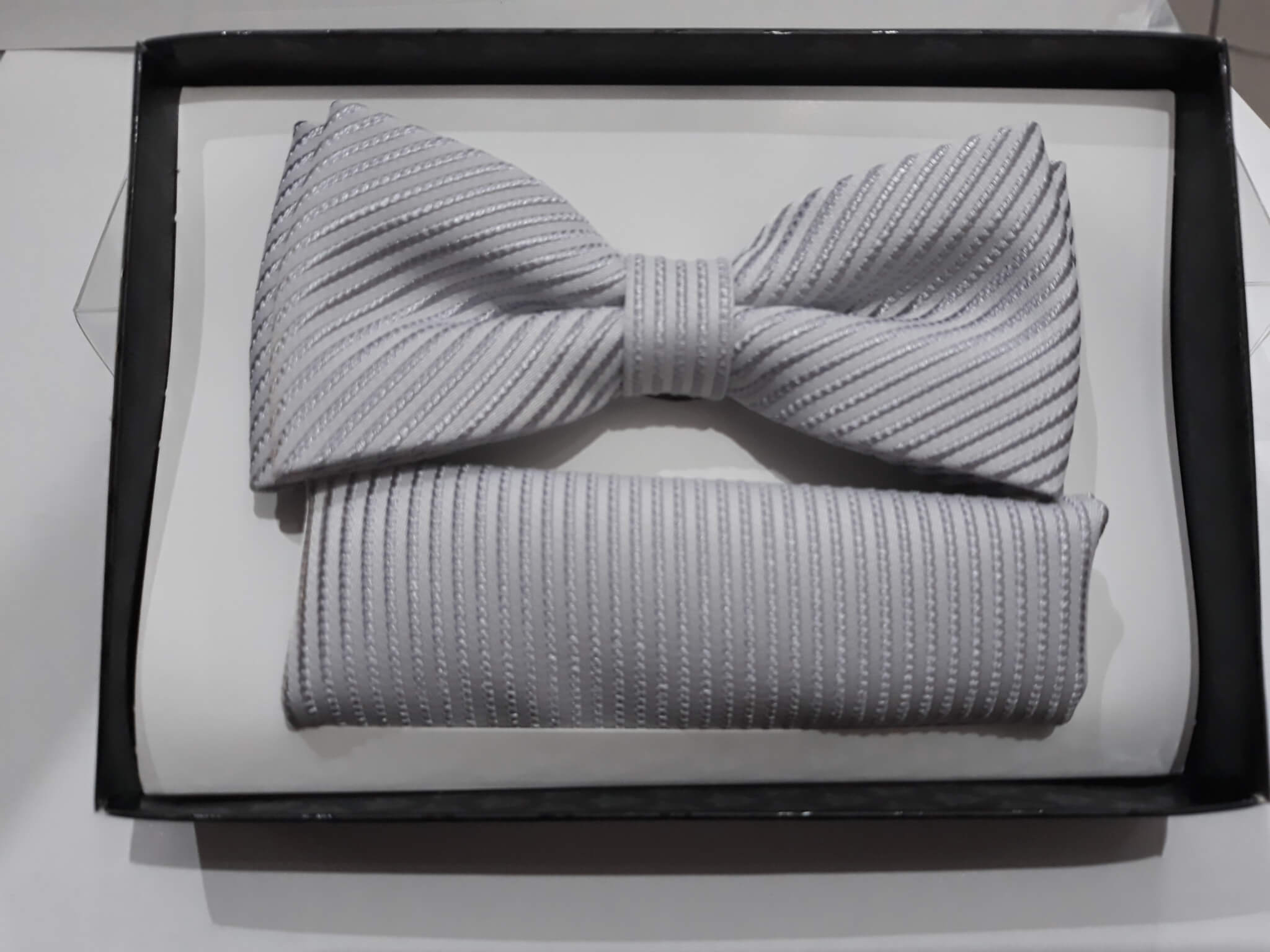 Mucha nie jest ręcznie wiązana lecz zawiązana na stałe. Pasek od muchy posiada regulację zapięcia. Komplet ten zawiera muchę wraz z poszetką widoczną na zdjęciu.