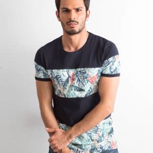 Granatowy t-shirt męski z motywem roślinnym