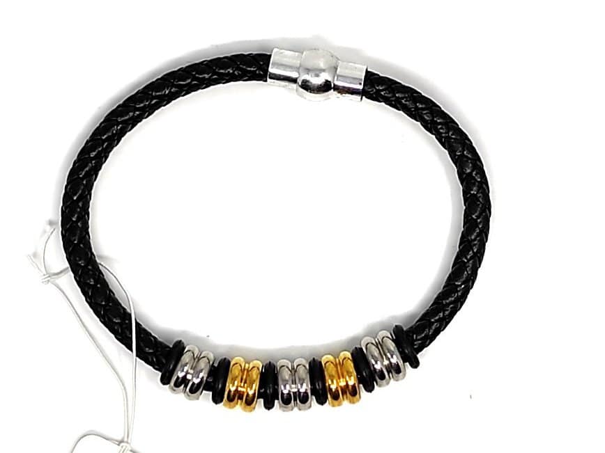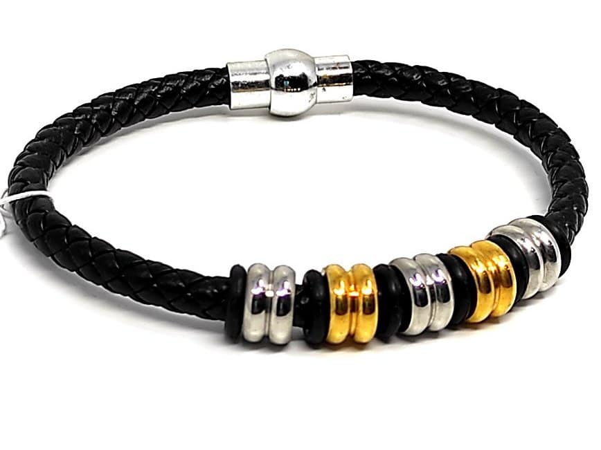 Bransoletka męska pleciona z eko-skóry, jest bardzo istotnym dodatkiem dla każdego eleganckiego mężczyzny. Zapinana na magnes. Idealnie będzie się prezentowała na dłoni. Widniejące na niej złoto-srebrne beadsy sprawiają, że każdy gentelman będzie chciał ją nosić. Są bardzo uniwersalne. Z pewnością pasują do każdej stylizacji. Dodają efektywności, gracji oraz wdzięku. Bez wątpienia to wspaniały pomysł na prezent dla każdego nowoczesnego mężczyzny, który idzie za najnowszymi trendami modowymi.