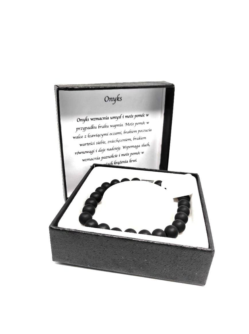 Bransoletka męska onyks kamień magiczny-kamień sily. Wykonana z kamieni naturalnych w kolorze czarnym. Bransoletka z onyksu to doskonały wybór dla mężczyzn chcących czuć się bezpiecznie oraz potrzebujących spokoju, wsparcia. To dodatek najczęściej wybierany przez osoby ceniące podróże, szukające miłości lub chcące utrzymać dobre relacje z rodziną i przyjaciółmi.
