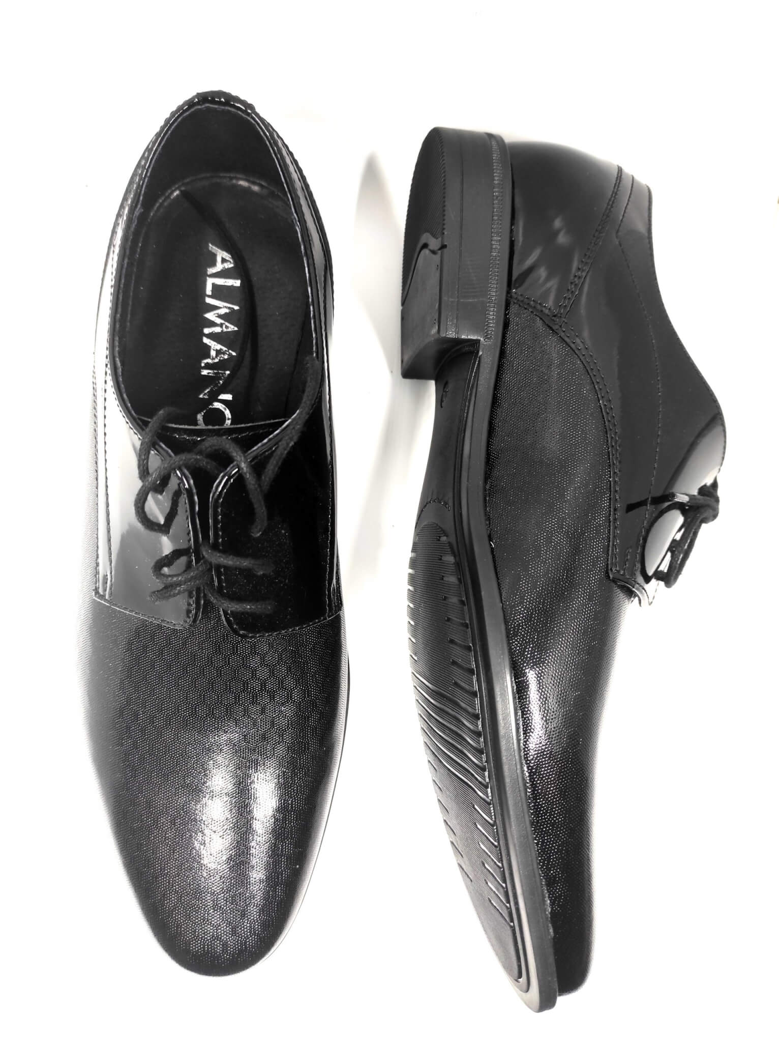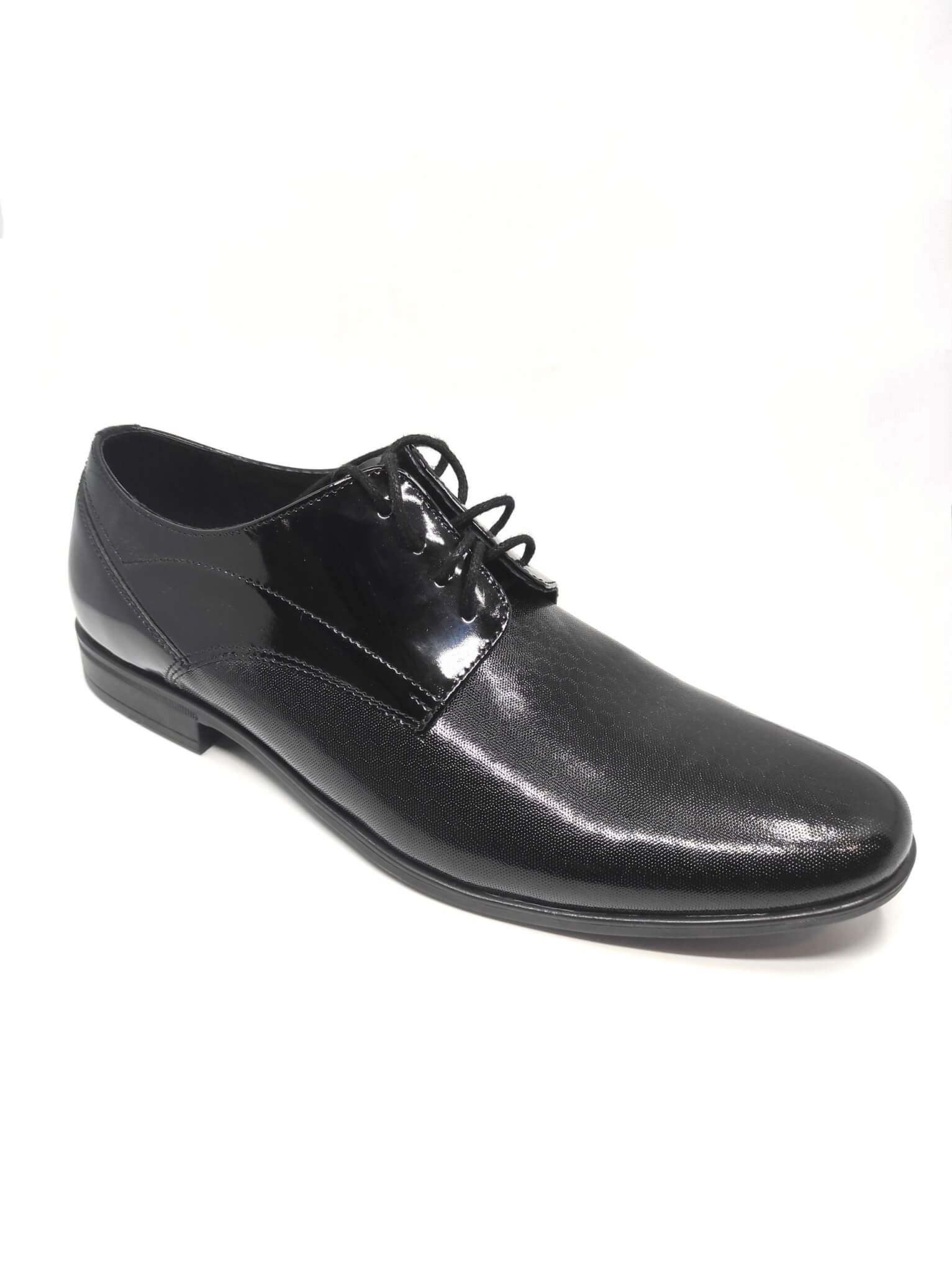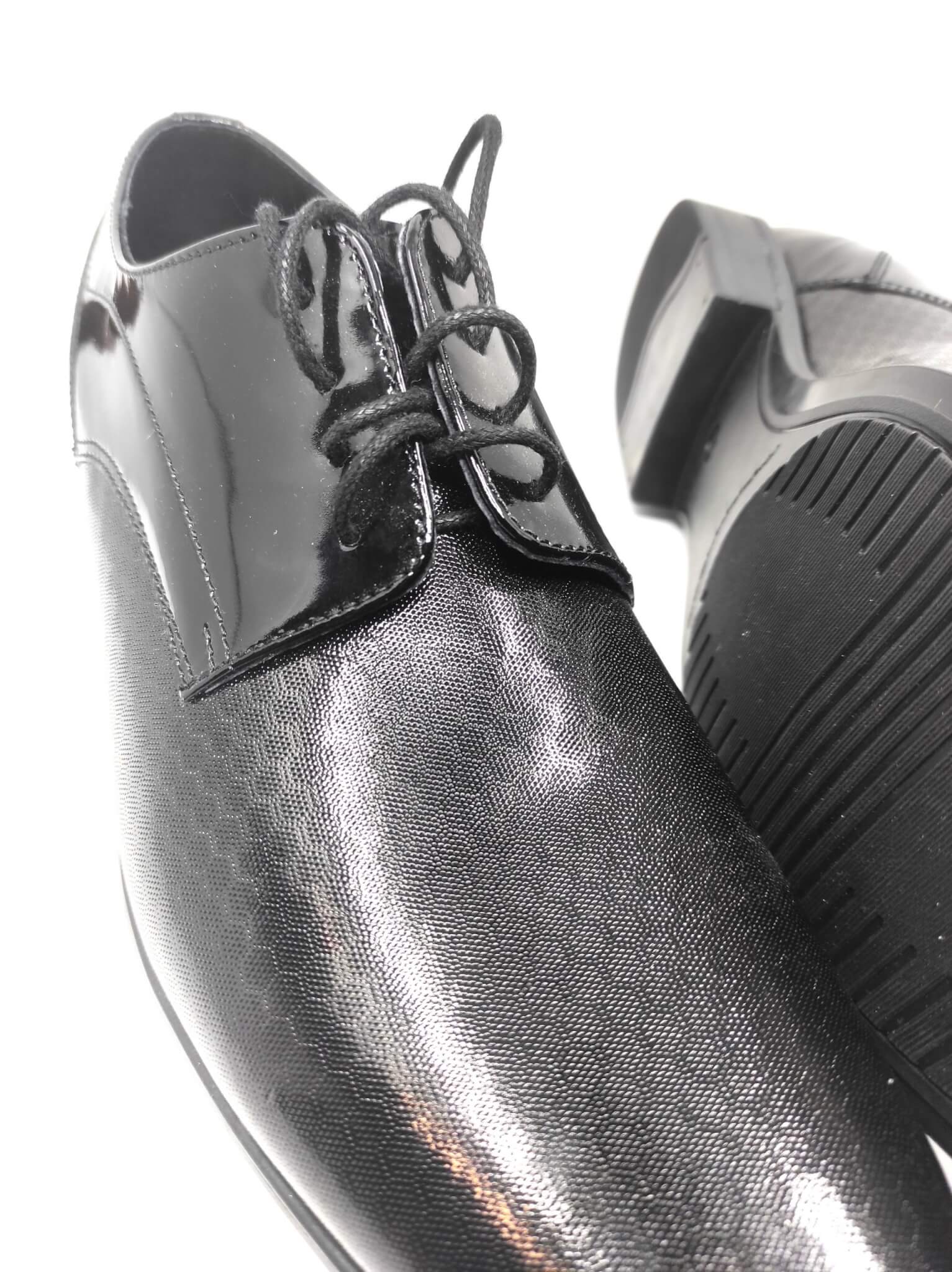 Eleganckie, skórzane męskie pantofle wykonane z czarnej, wysokogatunkowej skóry pokrytej wyczuwalną w dotyku teksturą i odcinającą się kolorystycznie sznurówką. Buty posiadają spiczaste noski. Podeszwy wykończone niebieską obwódką. Obuwie prezentuje się stylowo i elegancko natomiast miękka, skórzana, znakomicie wyprofilowana wkładka wewnątrz obuwia z pewnością zapewnia wygodę podczas chodzenia.