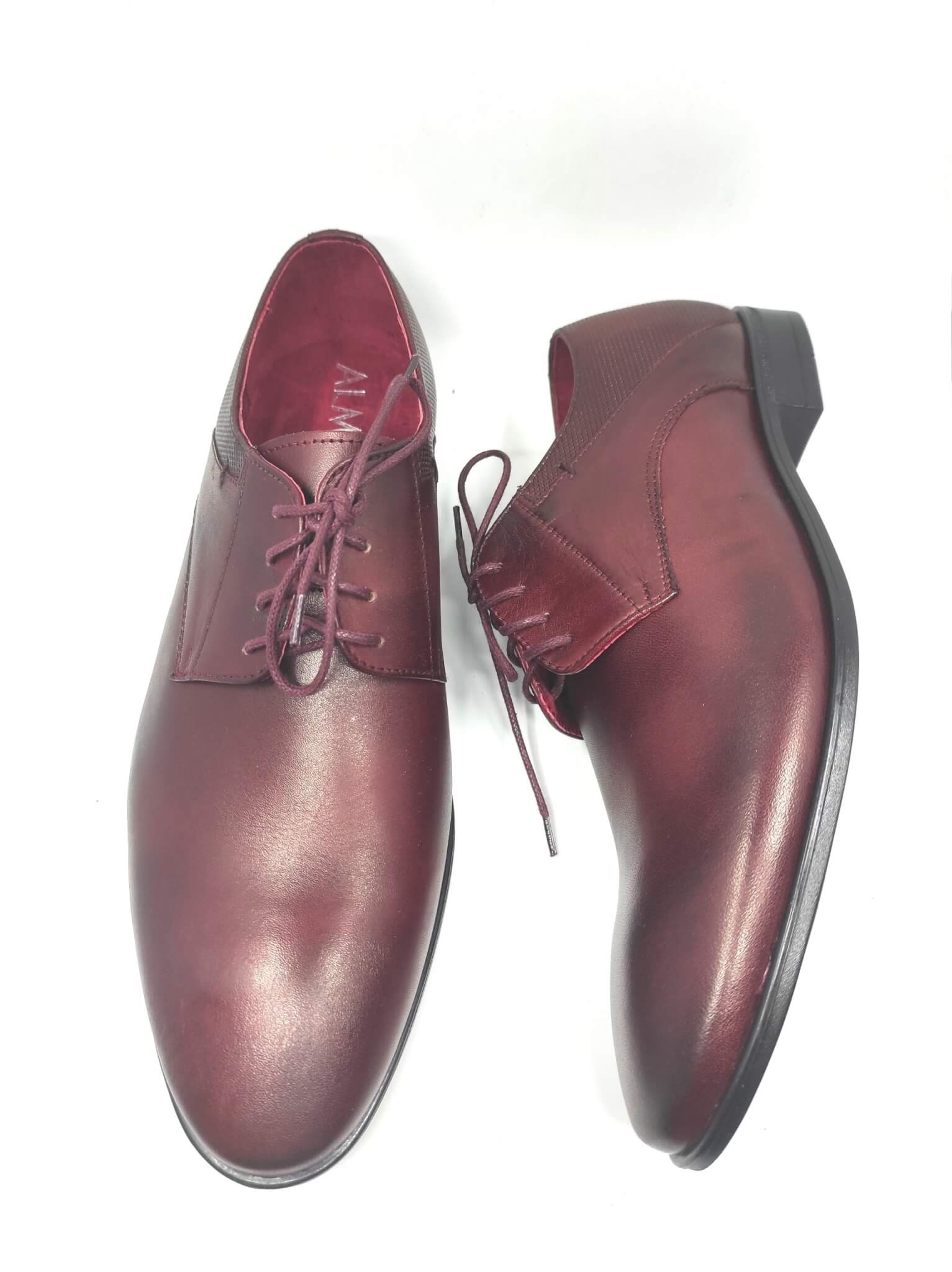 Eleganckie, skórzane męskie pantofle wykonane z bordowej, wysokogatunkowej skóry pokrytej wyczuwalną w dotyku teksturą i odcinającą się kolorystycznie sznurówką. Buty mają spiczaste noski więc obuwie prezentuje się stylowo i elegancko natomiast miękka, skórzana, znakomicie wyprofilowana wkładka wewnątrz obuwia zapewnia wygodę podczas chodzenia.