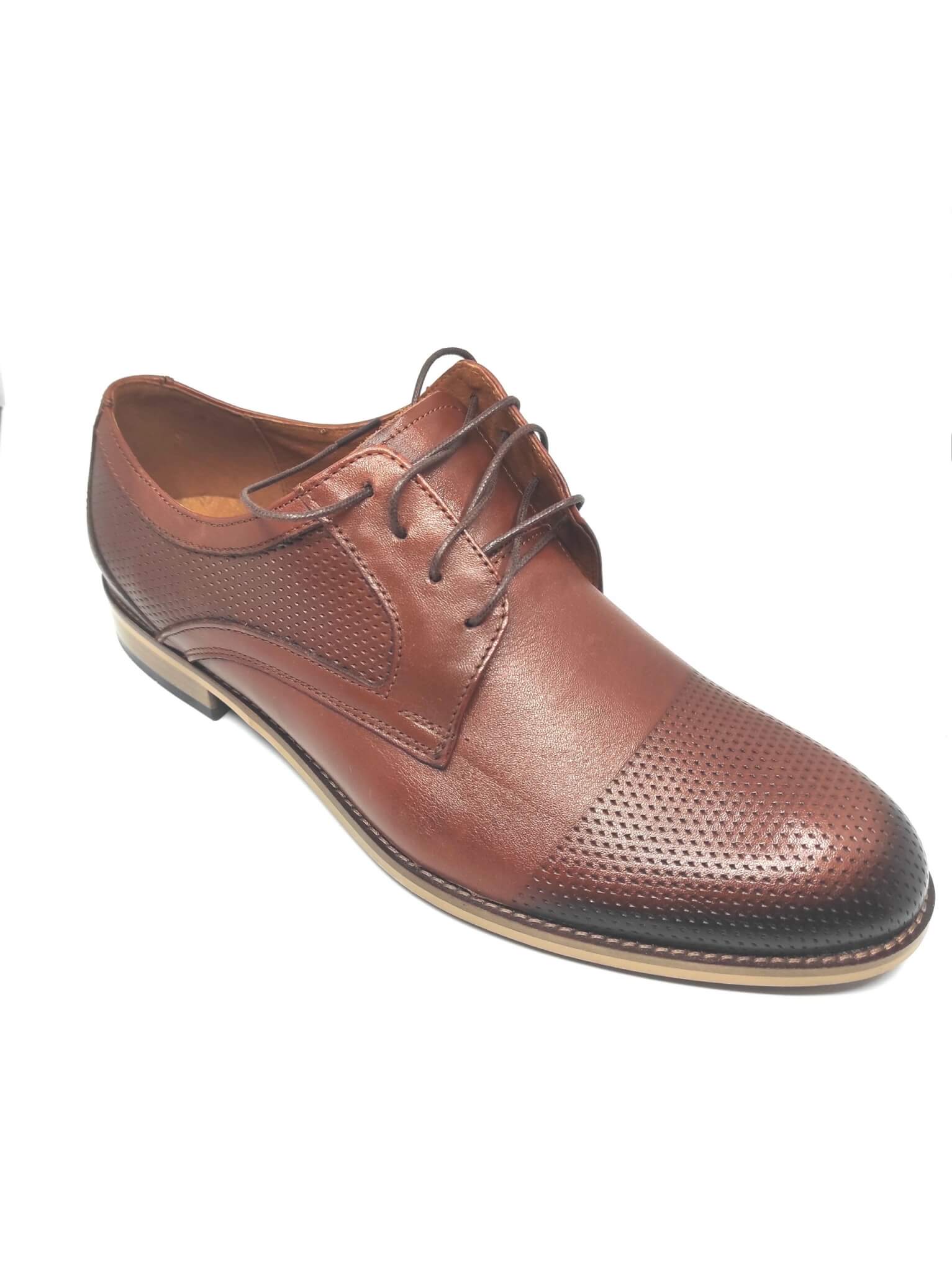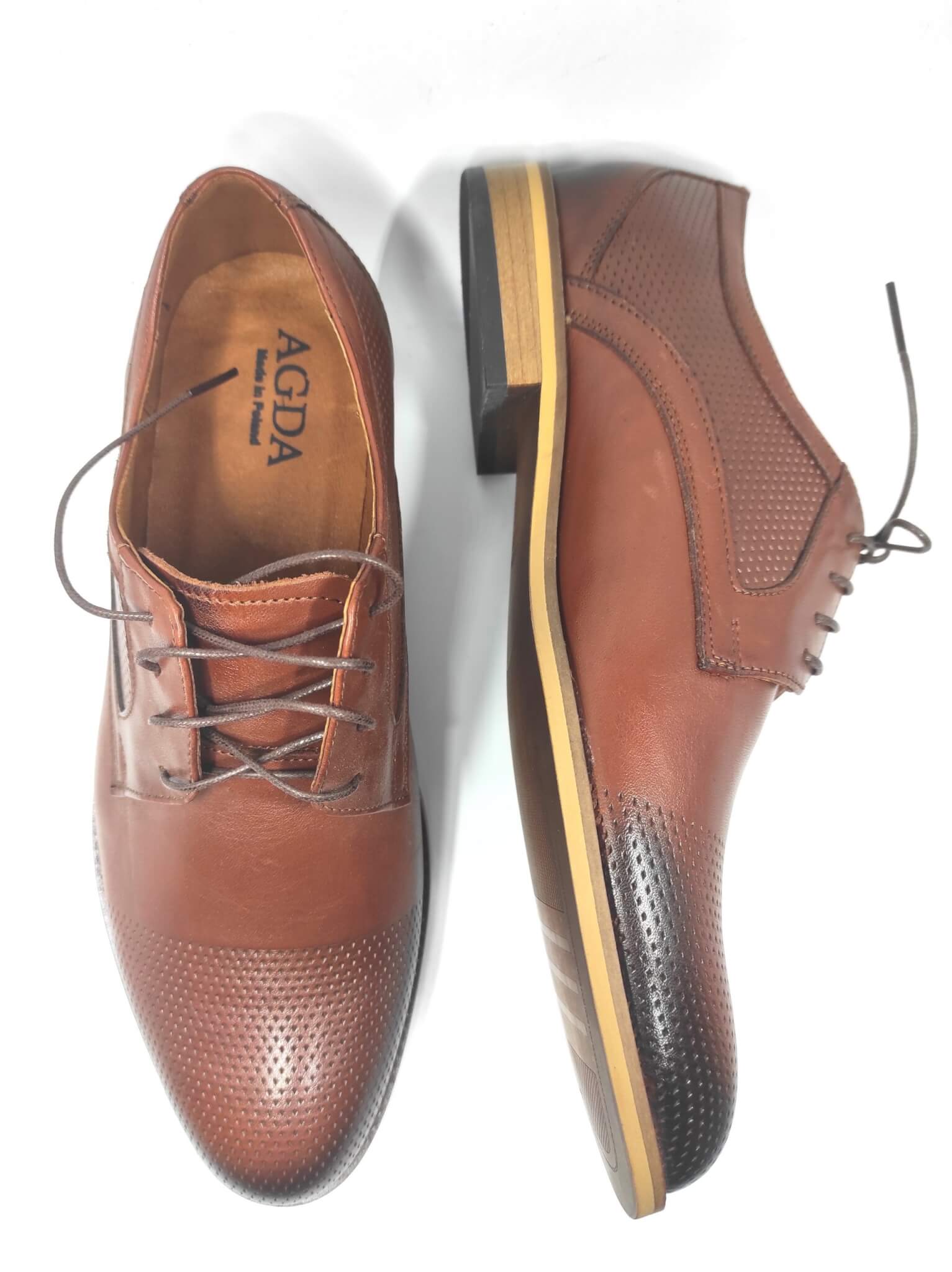 Eleganckie, skórzane męskie pantofle wykonane z brązowej skóry bydlęcej i odcinającą się kolorystycznie sznurówką. Buty mają spiczaste noski więc obuwie prezentuje się stylowo i elegancko natomiast miękka, skórzana, znakomicie wyprofilowana wkładka wewnątrz obuwia zapewnia komfort podczas chodzenia.