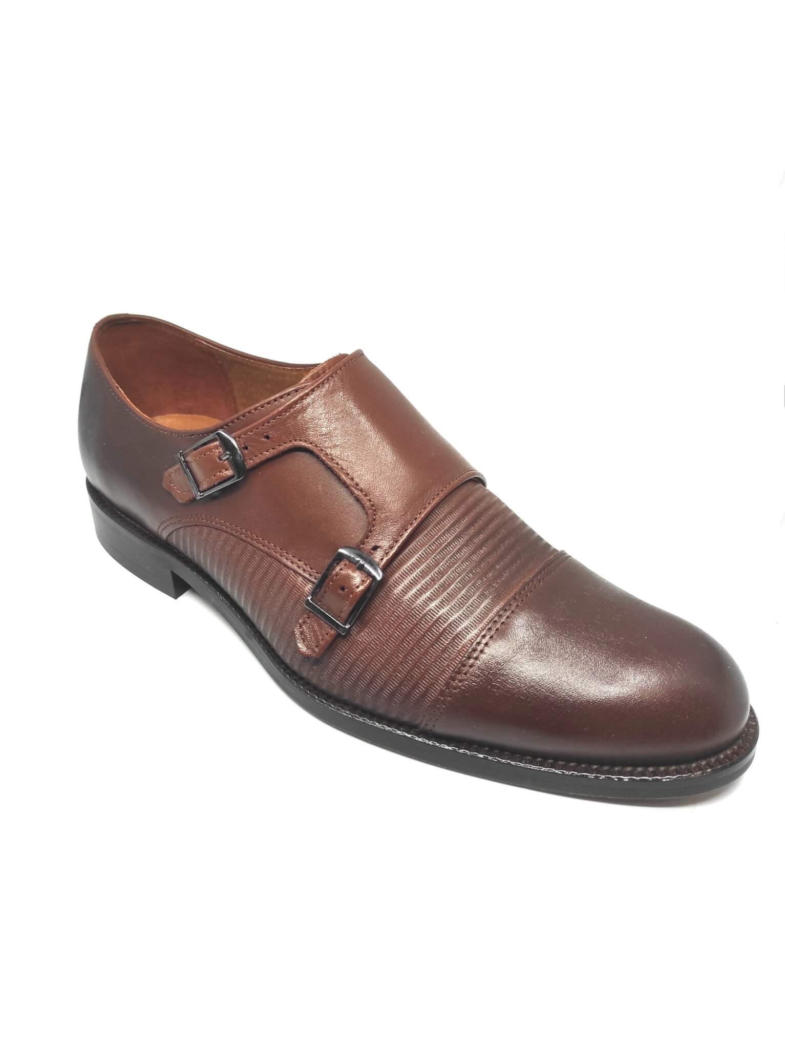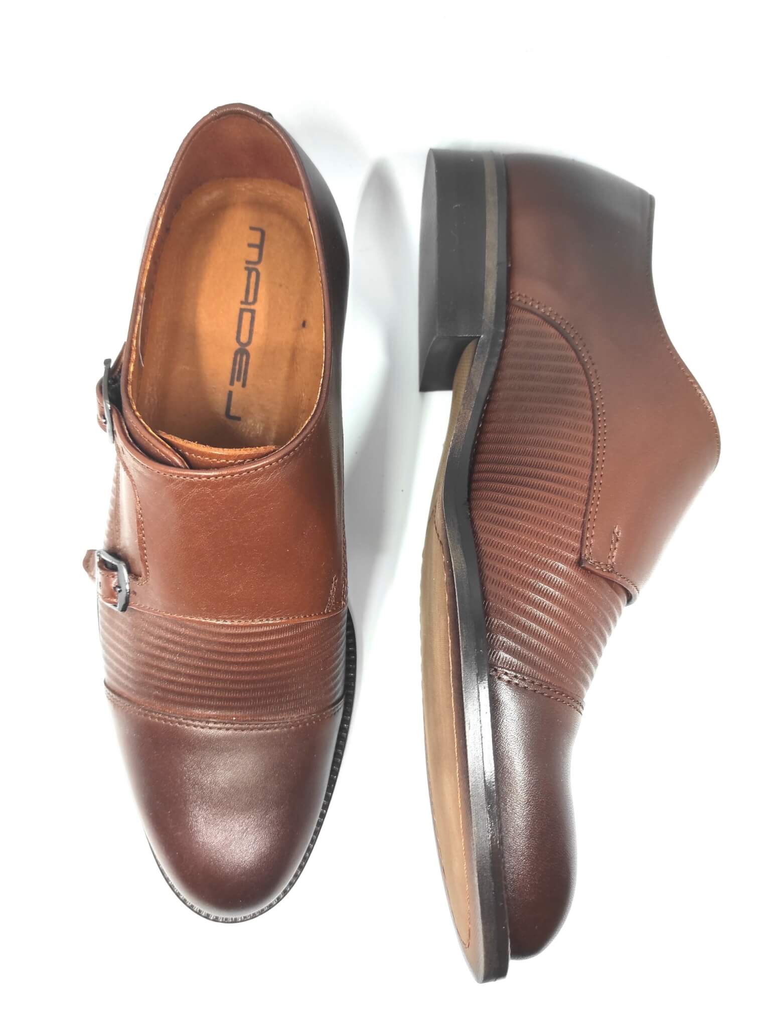 Eleganckie, skórzane męskie pantofle wykonane z granatowej skóry bydlęcej,charakterystycznie zapinane na klamry. Buty mają spiczaste noski więc obuwie prezentuje się stylowo i elegancko natomiast miękka, skórzana, znakomicie wyprofilowana wkładka wewnątrz obuwia zapewnia komfort podczas chodzenia.