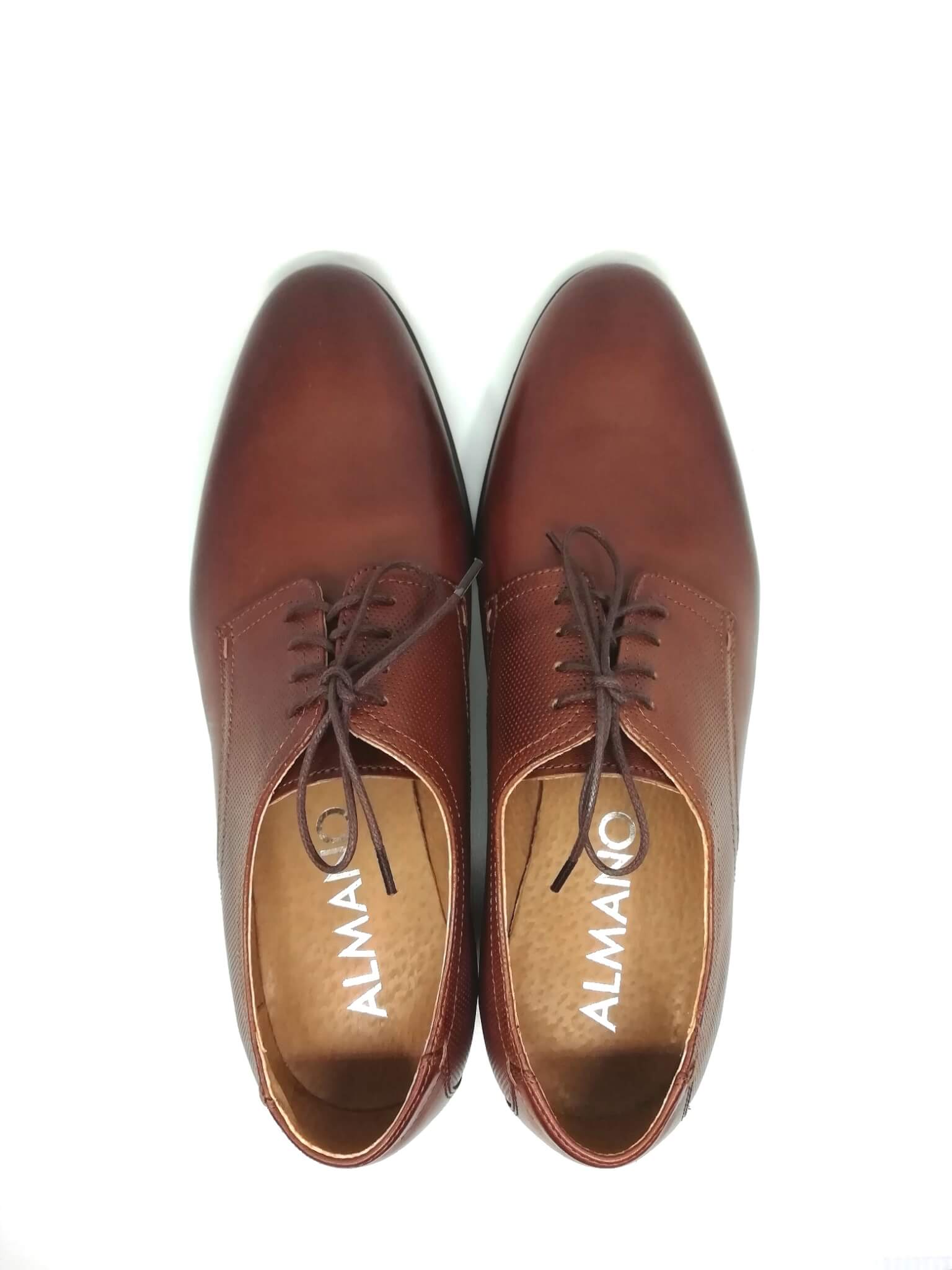 Eleganckie, skórzane męskie pantofle wykonane z brązowej, wysokogatunkowej skóry pokrytej wyczuwalną w dotyku teksturą i dobraną kolorystycznie sznurówką. Buty mają spiczaste noski więc obuwie prezentuje się stylowo i elegancko natomiast miękka, skórzana, znakomicie wyprofilowana wkładka wewnątrz obuwia zapewnia wygodę podczas chodzenia.