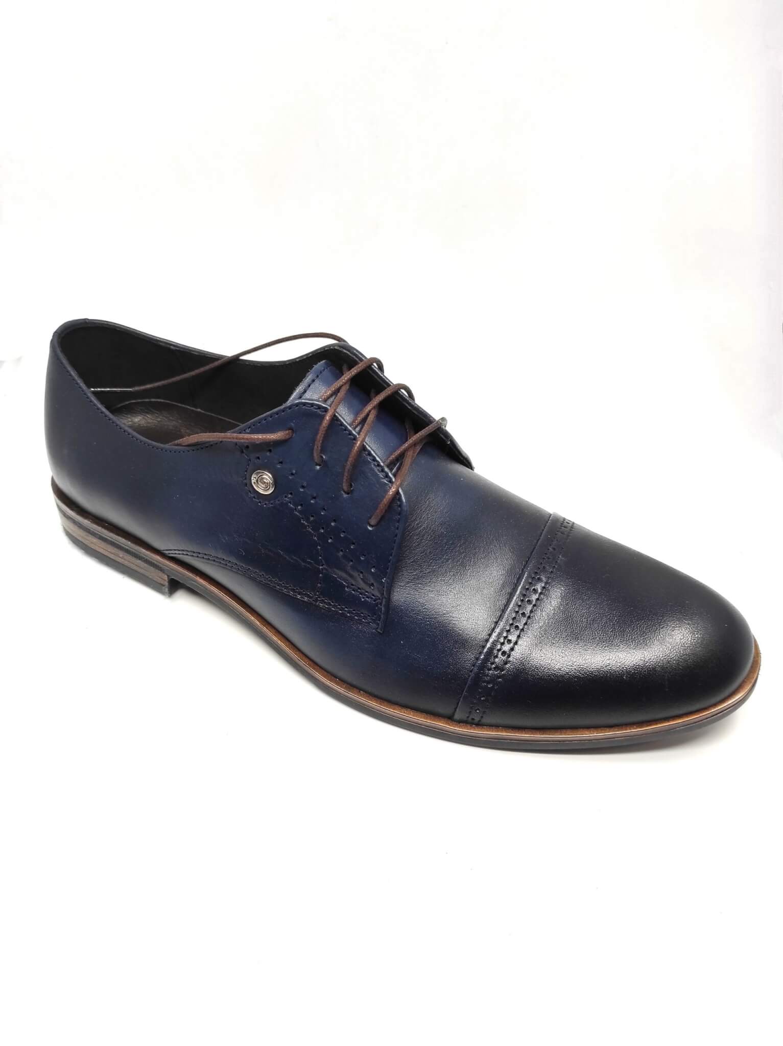 Eleganckie, skórzane męskie pantofle wykonane z granatowej skóry bydlęcej i odcinającą się kolorystycznie sznurówką. Buty mają spiczaste noski więc obuwie prezentuje się stylowo i elegancko natomiast miękka, skórzana, znakomicie wyprofilowana wkładka wewnątrz obuwia zapewnia komfort podczas chodzenia.