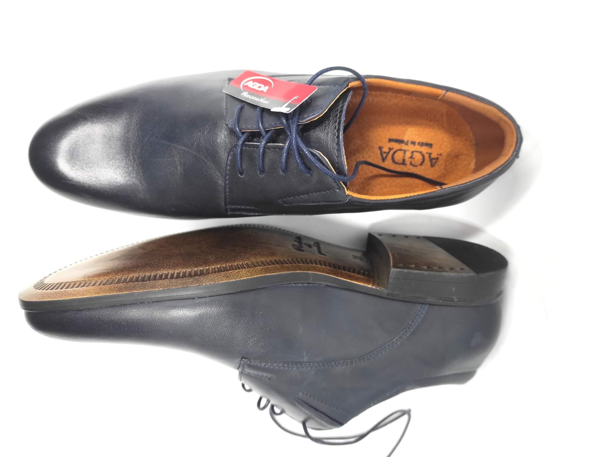 Eleganckie, skórzane męskie pantofle wykonane z granatowej skóry bydlęcej i odcinającą się kolorystycznie sznurówką. Buty mają spiczaste noski więc obuwie prezentuje się stylowo i elegancko natomiast miękka, skórzana, znakomicie wyprofilowana wkładka wewnątrz obuwia zapewnia komfort podczas chodzenia.