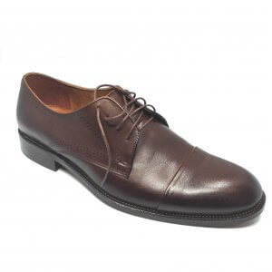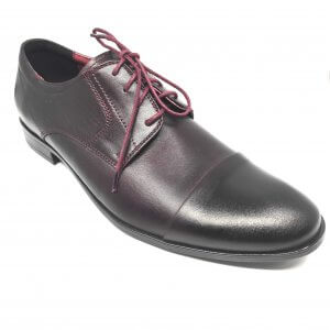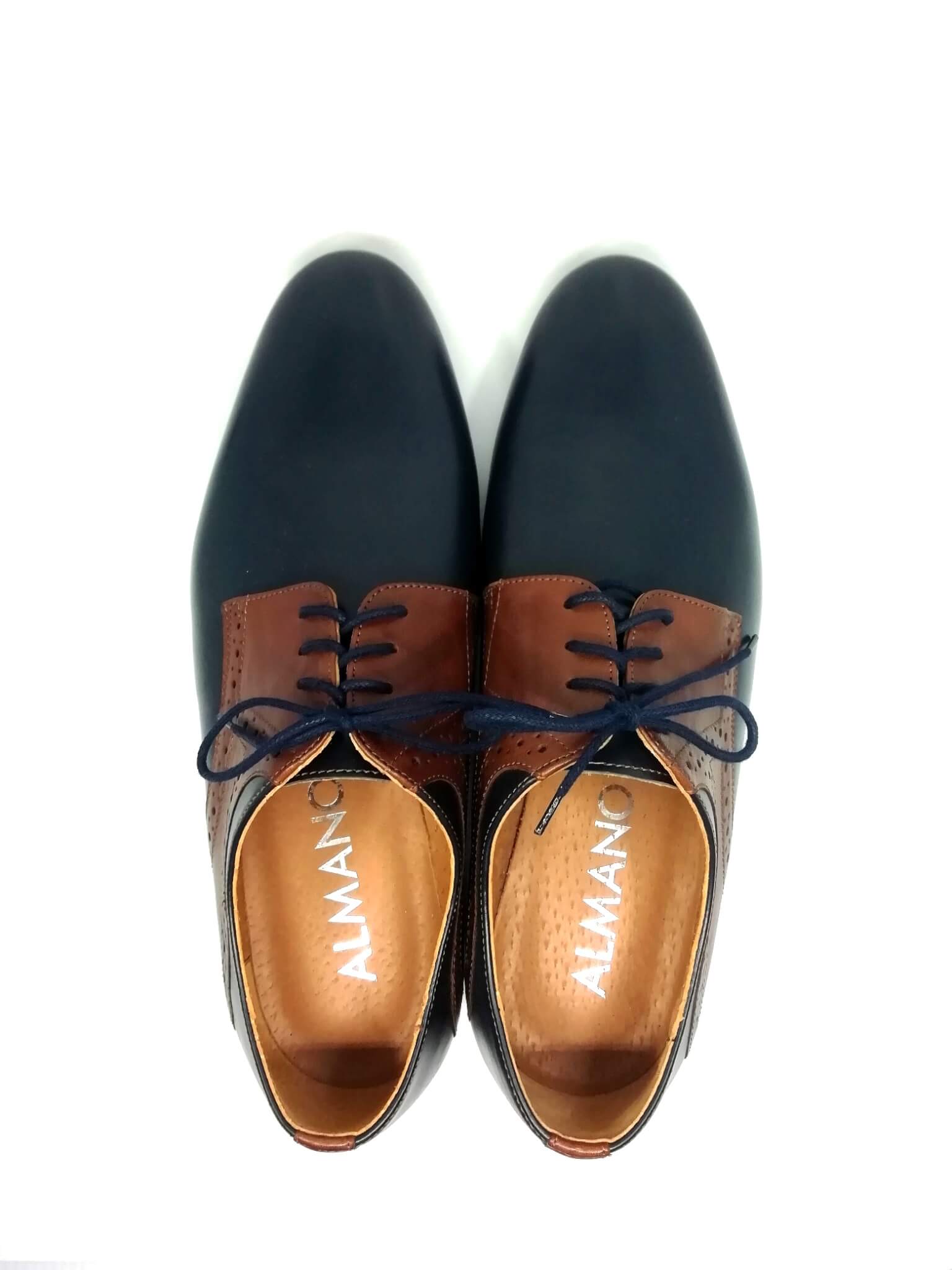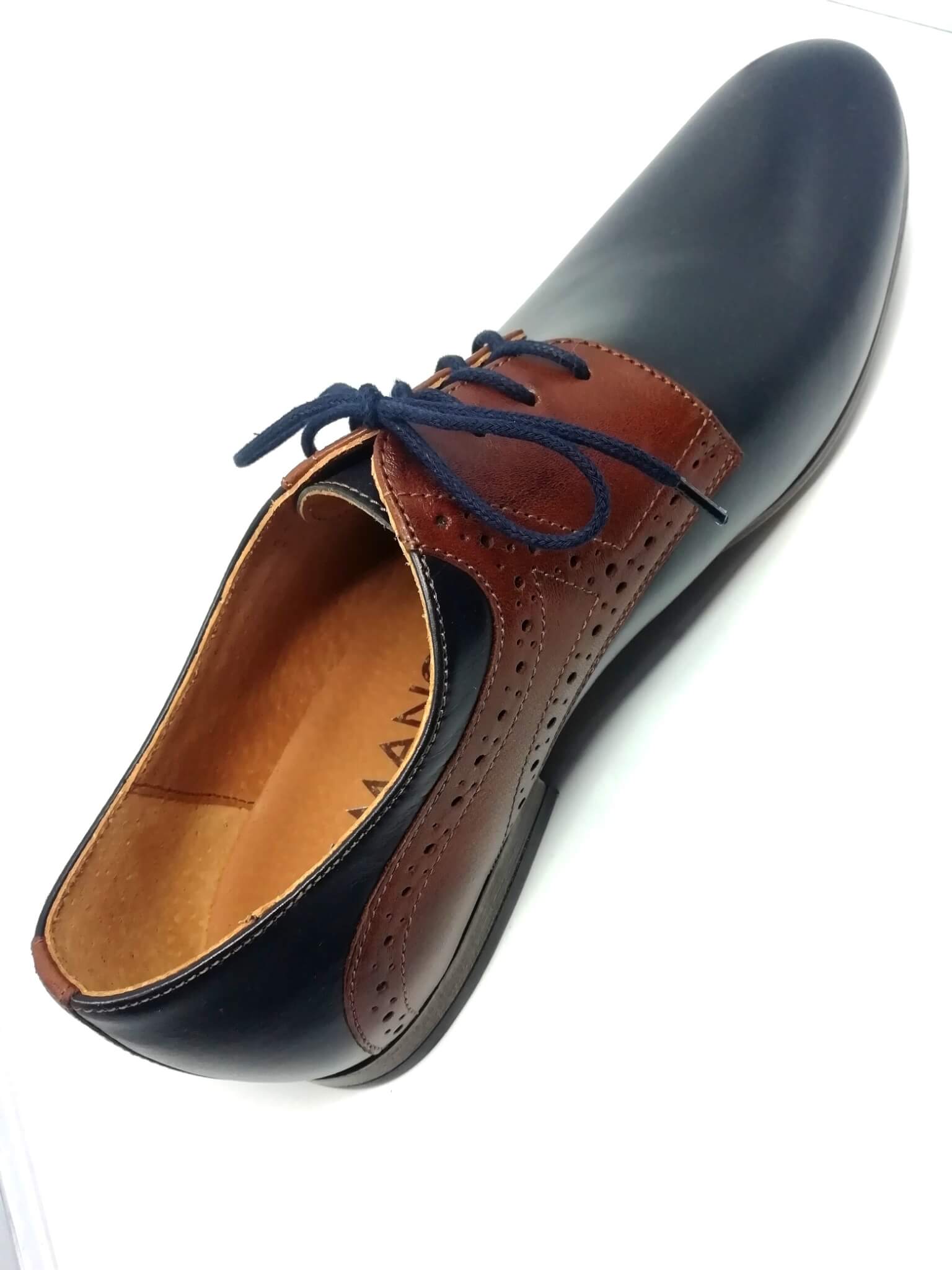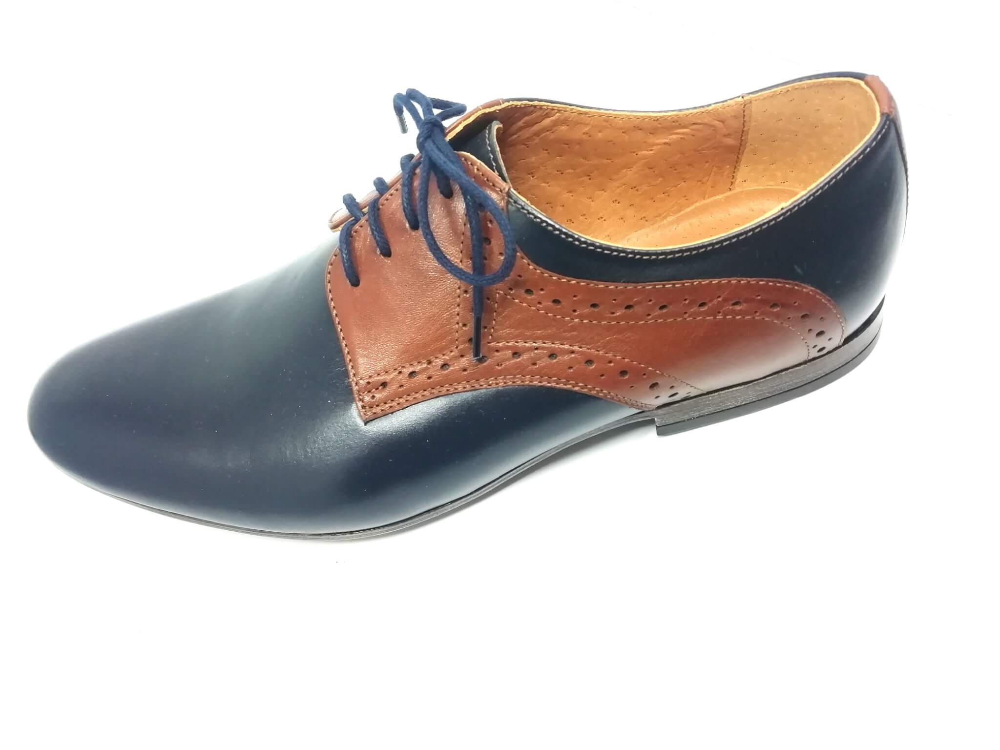 Eleganckie, skórzane męskie pantofle wykonane z granatowej, wysokogatunkowej skóry pokryta gładka w dotyku teksturą i odcinającą się kolorystycznie sznurówką. Buty mają spiczaste noski, wykończone brązową skóra. Obuwie prezentuje się stylowo i elegancko natomiast miękka, skórzana, znakomicie wyprofilowana wkładka wewnątrz obuwia z pewnością zapewnia wygodę podczas chodzenia.