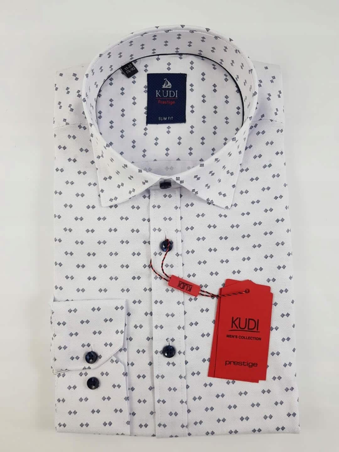 Elegancka Koszula z najnowszej kolekcji firmy Kudi Biała w Granatowe Kwadraty.