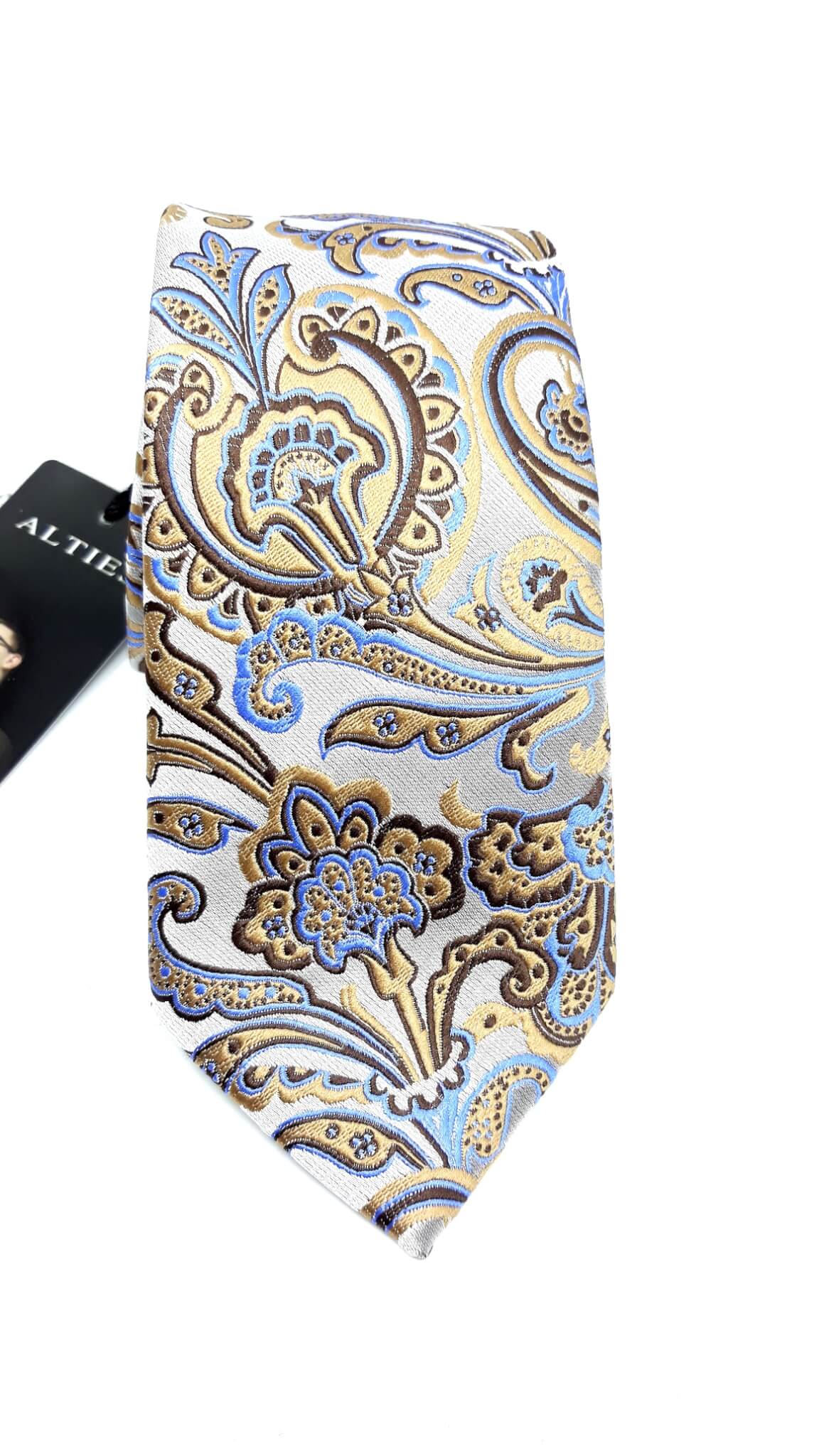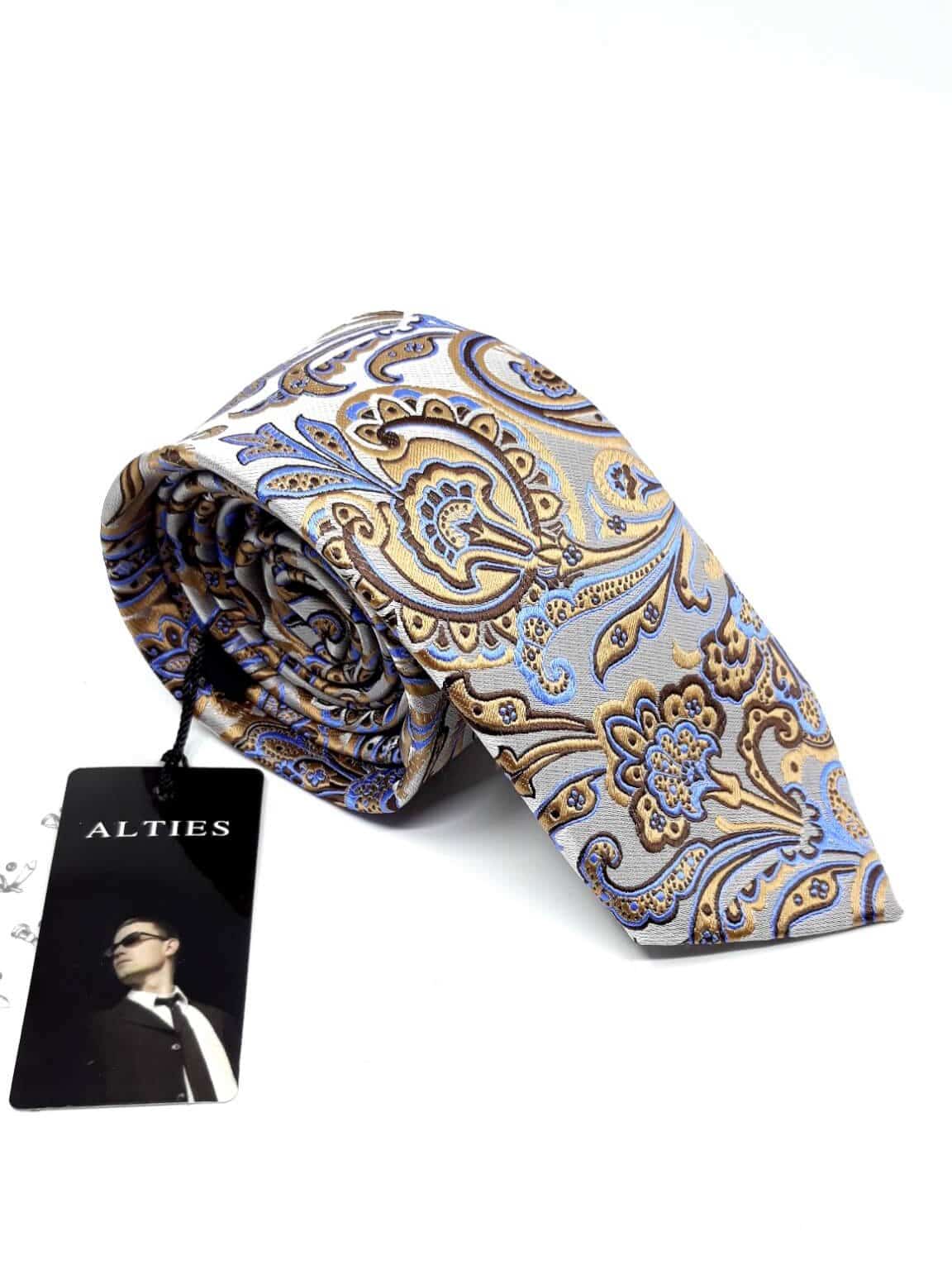 Elegancki krawat męski firmy Alties o klasycznym i modnym kroju, beżowy w złoto niebieski wzór. Krawat o klasycznym i modnym kroju, wykonany z microfibry. Jest on bardzo ważnym elementem ubioru, dzięki któremu każdy mężczyzna może wnieść do swojego stroju odrobinę koloru. Kompletując garderobę należy pamiętać, aby krawat tworzył spójny zestaw z marynarką lub koszulą. Jego unikatowy wzór z pewnością spełni swoją funkcję w połączeniu z różnymi tkaninami w kilku wariantach kolorystycznych. Ponadto wyraźne i mocne akcenty zdobnicze dodadzą charakteru i pozwolą wyróżnić się stylem. Krawat można dobrać zarówno do karnacji, garnituru jak i temperamentu.