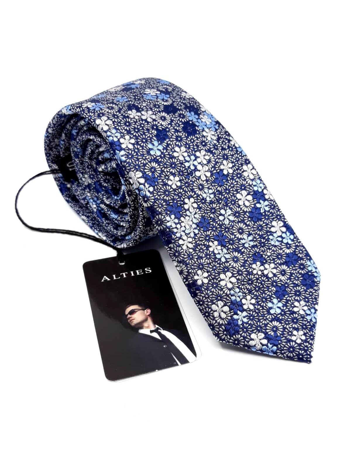 Elegancki krawat męski firmy Alties o klasycznym i modnym kroju w kolorze granatowym w bialo niebieskie kwiatuszki.Krawat o klasycznym i modnym kroju, wykonany z microfibry. Jest on bardzo ważnym elementem ubioru, dzięki któremu każdy mężczyzna może wnieść do swojego stroju odrobinę koloru. Kompletując garderobę należy pamiętać, aby krawat tworzył spójny zestaw z marynarką lub koszulą. Jego unikatowy wzór z pewnością spełni swoją funkcję w połączeniu z różnymi tkaninami w kilku wariantach kolorystycznych. Ponadto wyraźne i mocne akcenty zdobnicze dodadzą charakteru i pozwolą wyróżnić się stylem. Krawat można dobrać zarówno do karnacji, garnituru jak i temperamentu.
