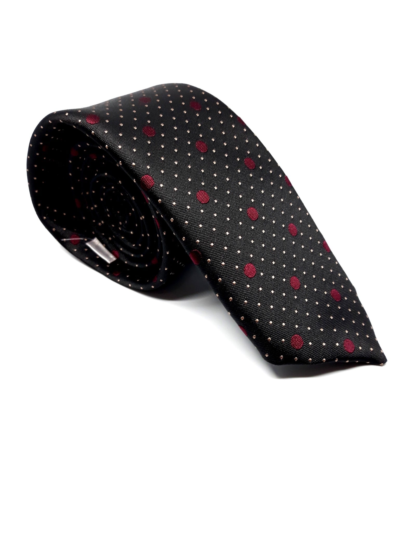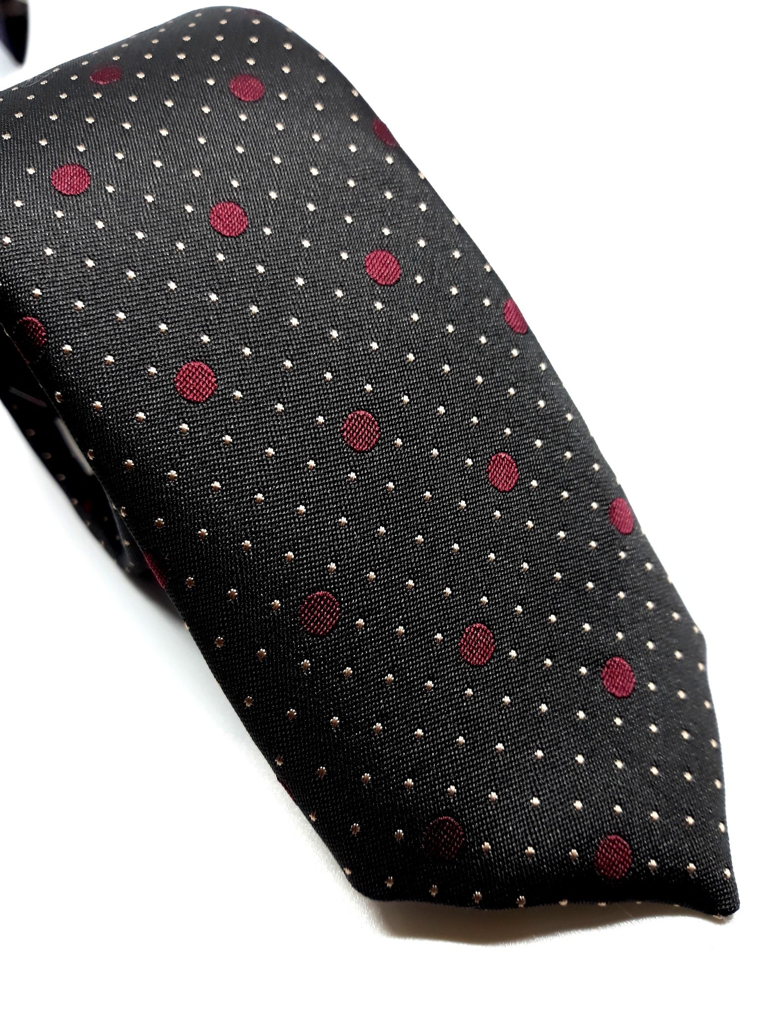 Elegancki krawat męski firmy Piotr o klasycznym i modnym kroju w kolorze czarnym w bordowe i beżowe kropki.Krawat o klasycznym i modnym kroju, wykonany ze sztucznego jedwabiu. Jest on bardzo ważnym elementem ubioru, dzięki któremu każdy mężczyzna może wnieść do swojego stroju odrobinę koloru. Kompletując garderobę należy pamiętać, aby krawat tworzył spójny zestaw z marynarką lub koszulą. Jego unikatowy wzór z pewnością spełni swoją funkcję w połączeniu z różnymi tkaninami w kilku wariantach kolorystycznych. Ponadto wyraźne i mocne akcenty zdobnicze dodadzą charakteru i pozwolą wyróżnić się stylem. Krawat można dobrać zarówno do karnacji, garnituru jak i temperamentu.