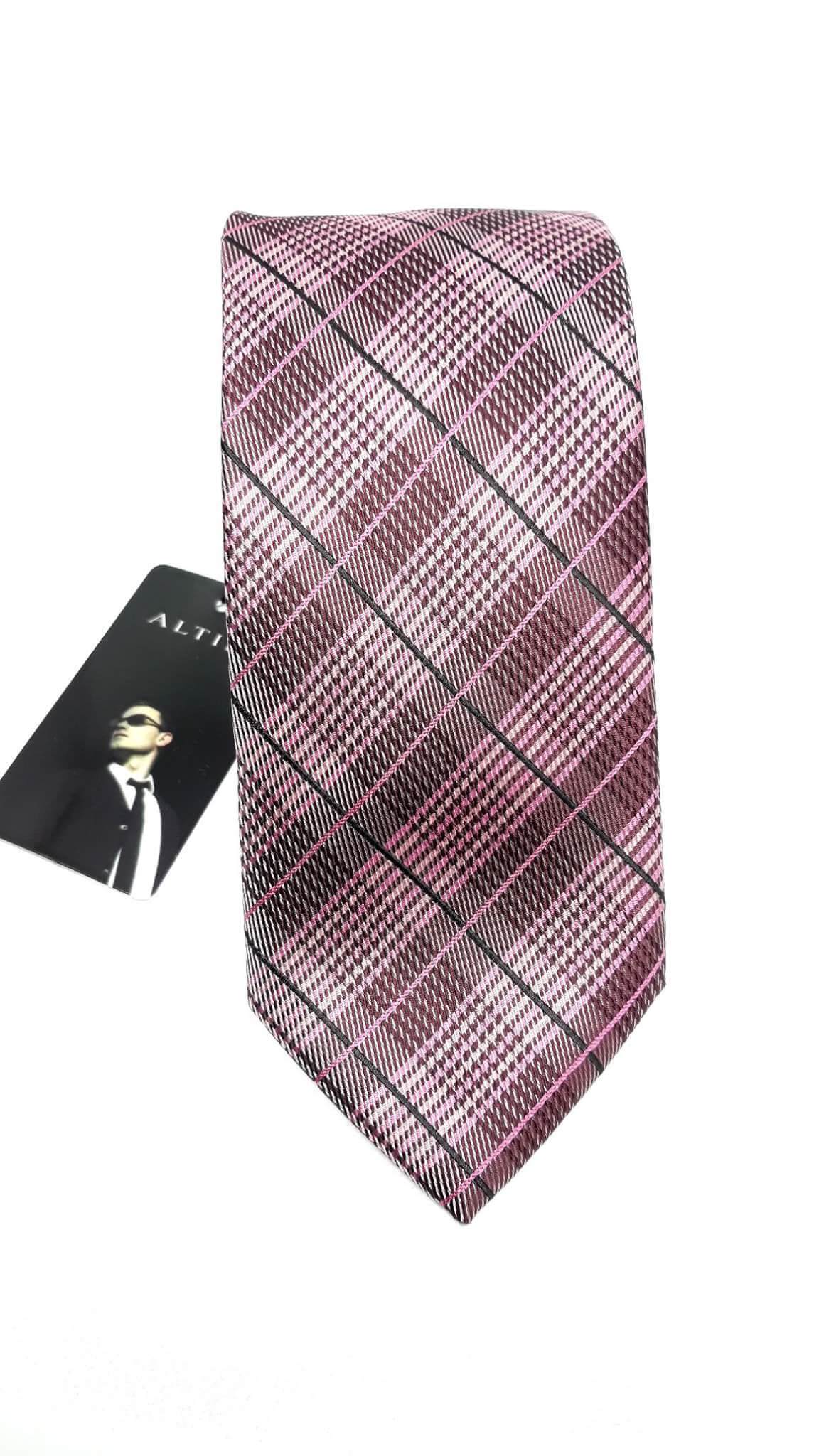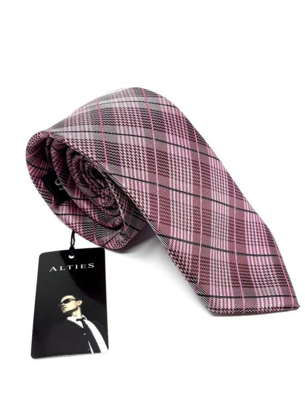 Elegancki krawat męski firmy Alties o klasycznym i modnym kroju, bordowo różowy we wzór. Krawat o klasycznym i modnym kroju, wykonany ze sztucznego jedwabiu. Jest on bardzo ważnym elementem ubioru, dzięki któremu każdy mężczyzna może wnieść do swojego stroju odrobinę koloru. Kompletując garderobę należy pamiętać, aby krawat tworzył spójny zestaw z marynarką lub koszulą. Jego unikatowy wzór z pewnością spełni swoją funkcję w połączeniu z różnymi tkaninami w kilku wariantach kolorystycznych. Ponadto wyraźne i mocne akcenty zdobnicze dodadzą charakteru i pozwolą wyróżnić się stylem. Krawat można dobrać zarówno do karnacji, garnituru jak i temperamentu.
