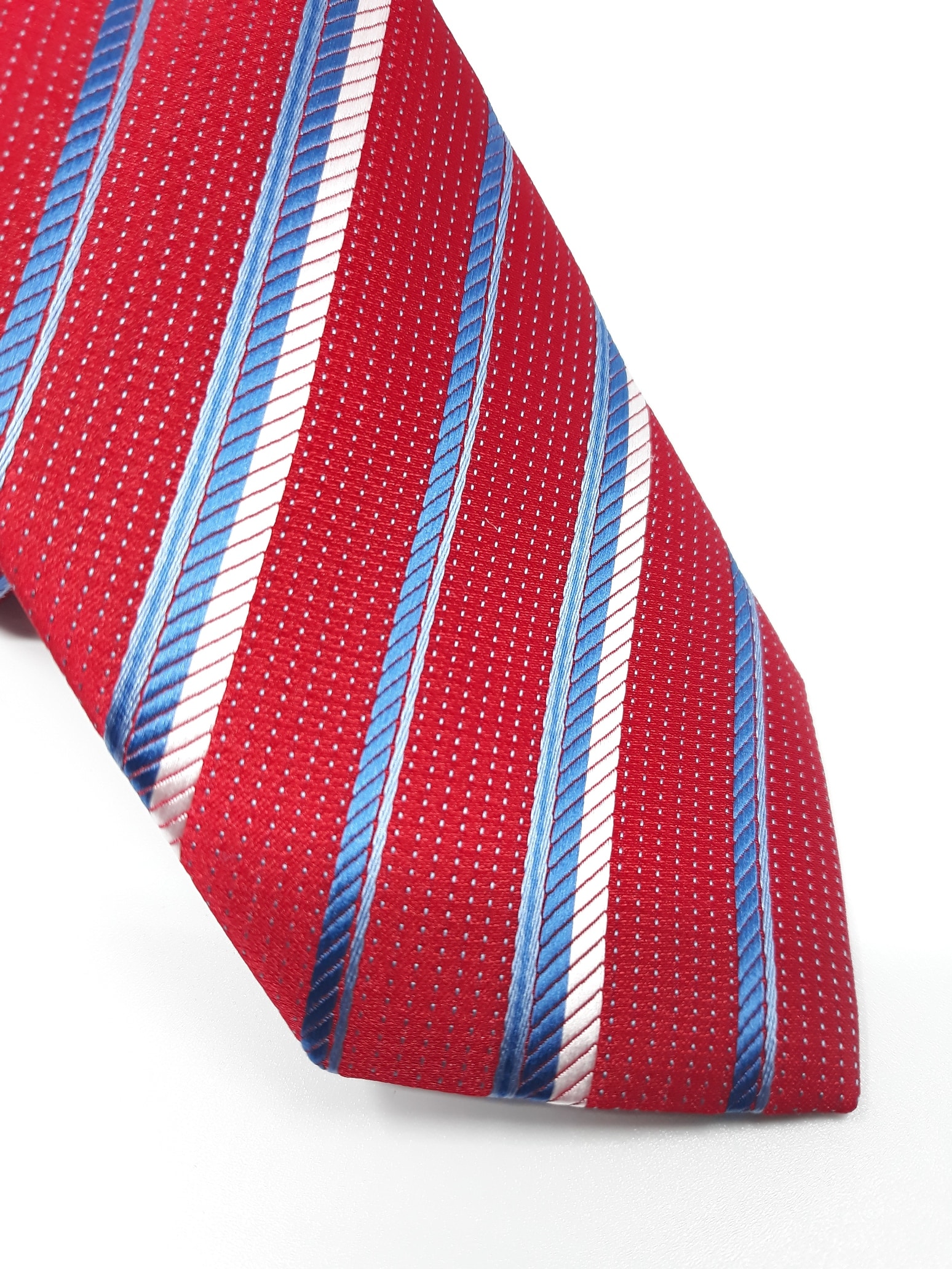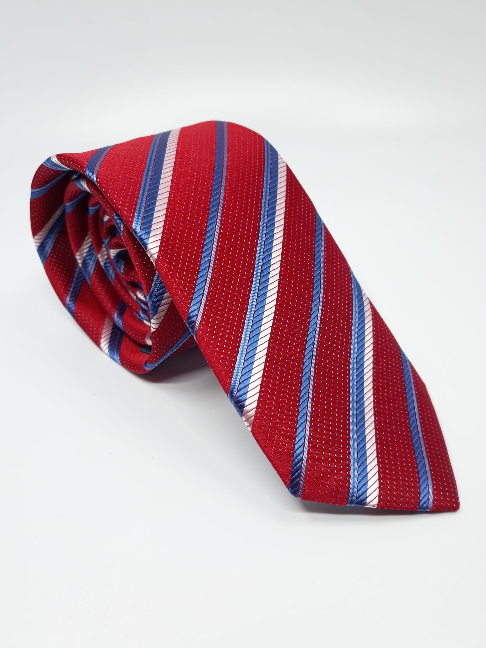 Elegancki krawat męski firmy Piotr o klasycznym i modnym kroju, bordowy w biało niebieskie paski. Krawat o klasycznym i modnym kroju, wykonany ze sztucznego jedwabiu. Jest on bardzo ważnym elementem ubioru, dzięki któremu każdy mężczyzna może wnieść do swojego stroju odrobinę koloru. Kompletując garderobę należy pamiętać, aby krawat tworzył spójny zestaw z marynarką lub koszulą. Jego unikatowy wzór z pewnością spełni swoją funkcję w połączeniu z różnymi tkaninami w kilku wariantach kolorystycznych. Ponadto wyraźne i mocne akcenty zdobnicze dodadzą charakteru i pozwolą wyróżnić się stylem. Krawat można dobrać zarówno do karnacji, garnituru jak i temperamentu.