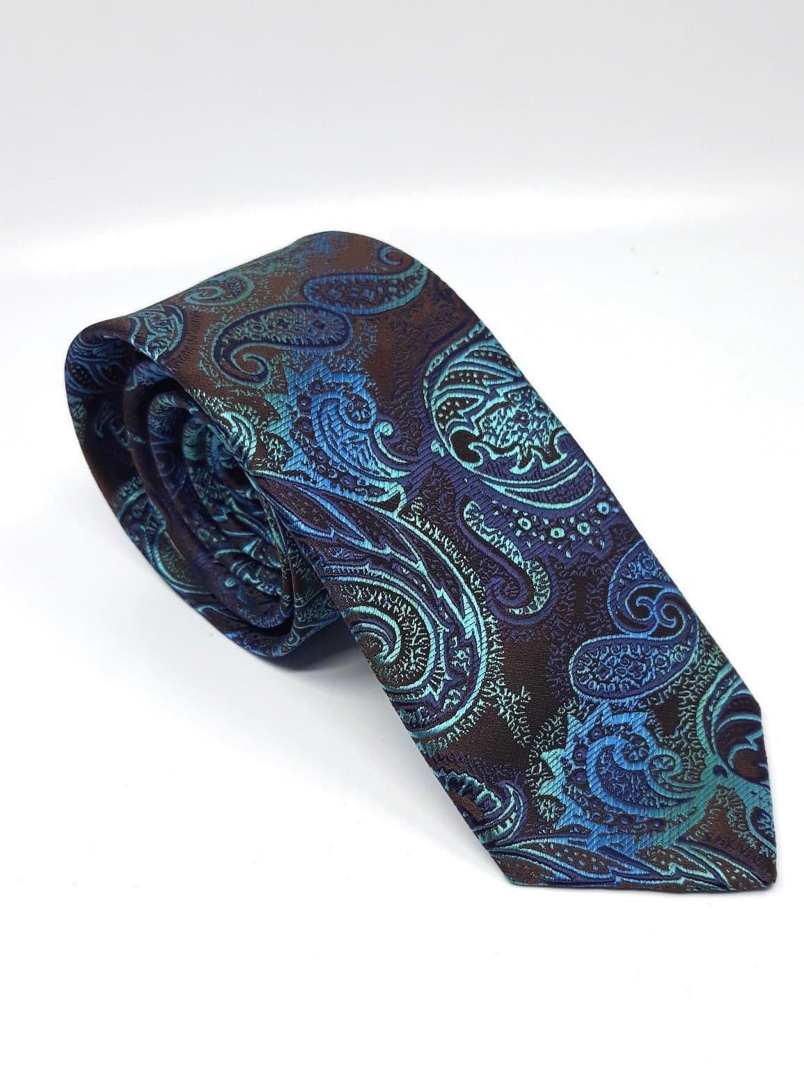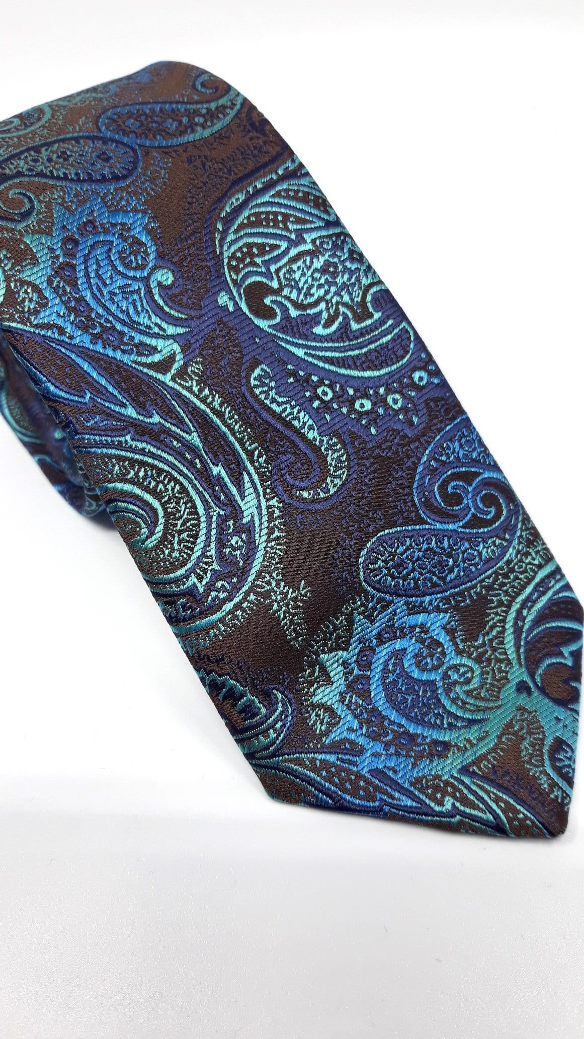 Elegancki krawat męski firmy Piotr o klasycznym i modnym kroju, brązowo turkusowy w turecki wzór.Krawat o klasycznym i modnym kroju, wykonany ze sztucznego jedwabiu. Jest on bardzo ważnym elementem ubioru, dzięki któremu każdy mężczyzna może wnieść do swojego stroju odrobinę koloru. Kompletując garderobę należy pamiętać, aby krawat tworzył spójny zestaw z marynarką lub koszulą. Jego unikatowy wzór z pewnością spełni swoją funkcję w połączeniu z różnymi tkaninami w kilku wariantach kolorystycznych. Ponadto wyraźne i mocne akcenty zdobnicze dodadzą charakteru i pozwolą wyróżnić się stylem. Krawat można dobrać zarówno do karnacji, garnituru jak i temperamentu.
