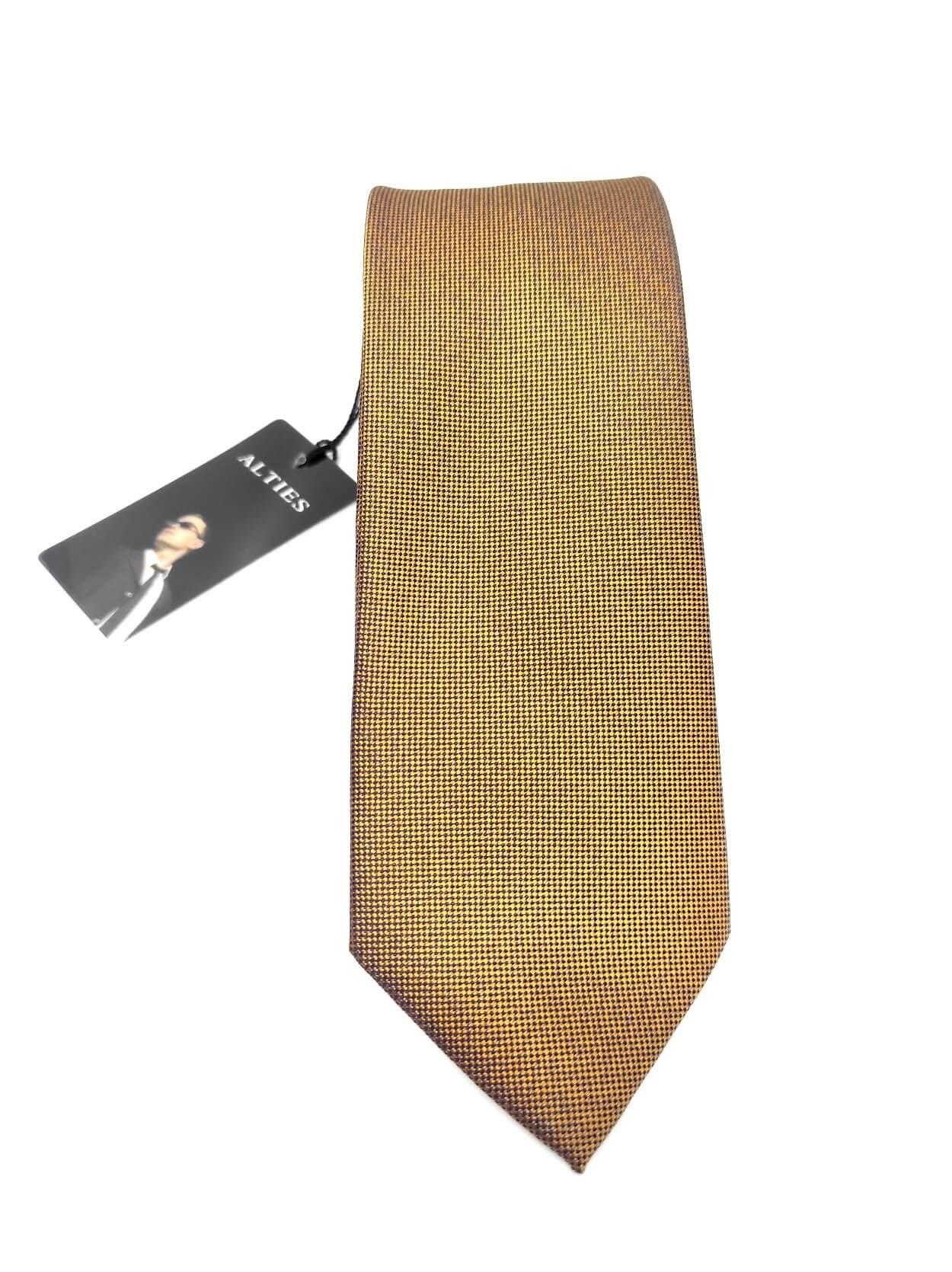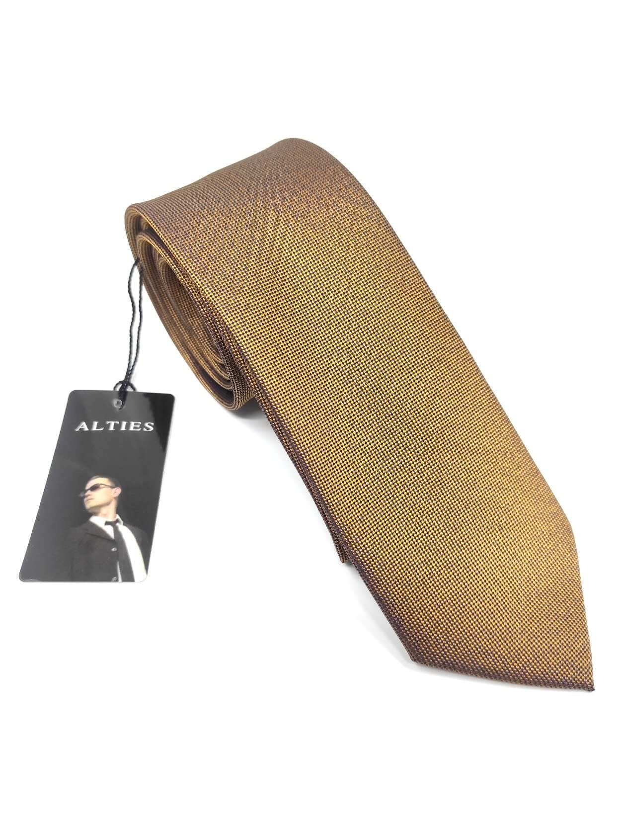 Elegancki krawat męski firmy Alties o klasycznym i modnym kroju,złoty. Krawat o klasycznym i modnym kroju, wykonany z microfibry. Jest on bardzo ważnym elementem ubioru, dzięki któremu każdy mężczyzna może wnieść do swojego stroju odrobinę koloru. Kompletując garderobę należy pamiętać, aby krawat tworzył spójny zestaw z marynarką lub koszulą. Jego unikatowy wzór z pewnością spełni swoją funkcję w połączeniu z różnymi tkaninami w kilku wariantach kolorystycznych. Ponadto wyraźne i mocne akcenty zdobnicze dodadzą charakteru i pozwolą wyróżnić się stylem. Krawat można dobrać zarówno do karnacji, garnituru jak i temperamentu.