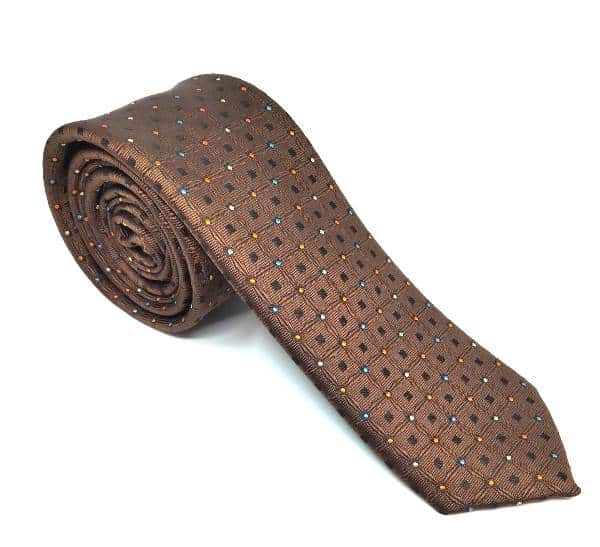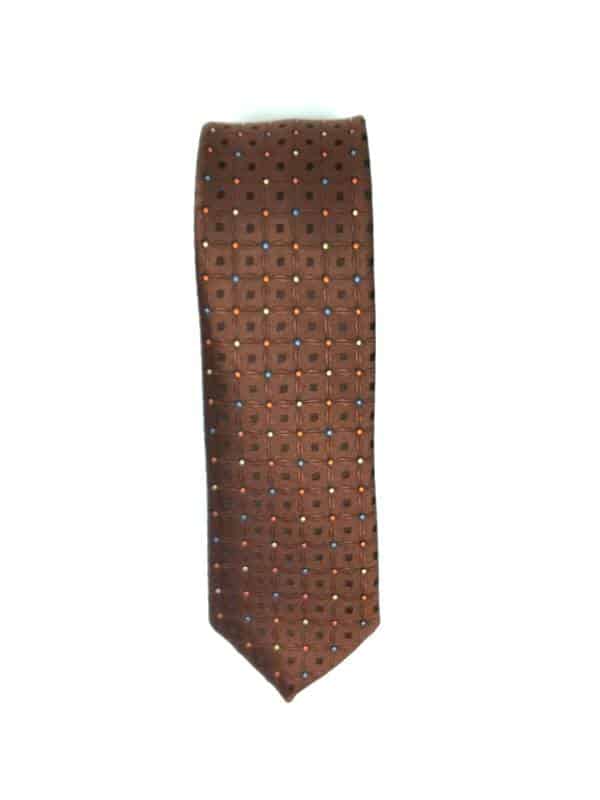 Elegancki krawat męski firmy Piotr, brązowy w kolorowe kropki. Krawat o klasycznym i modnym kroju, wykonany ze sztucznego jedwabiu. Jest on bardzo ważnym elementem ubioru, dzięki któremu każdy mężczyzna może wnieść do swojego stroju odrobinę koloru. Kompletując garderobę należy pamiętać, aby krawat tworzył spójny zestaw z marynarką lub koszulą. Jego unikatowy wzór z pewnością spełni swoją funkcję w połączeniu z różnymi tkaninami w kilku wariantach kolorystycznych. Ponadto wyraźne i mocne akcenty zdobnicze dodadzą charakteru i pozwolą wyróżnić się stylem. Krawat można dobrać zarówno do karnacji, garnituru jak i temperamentu.