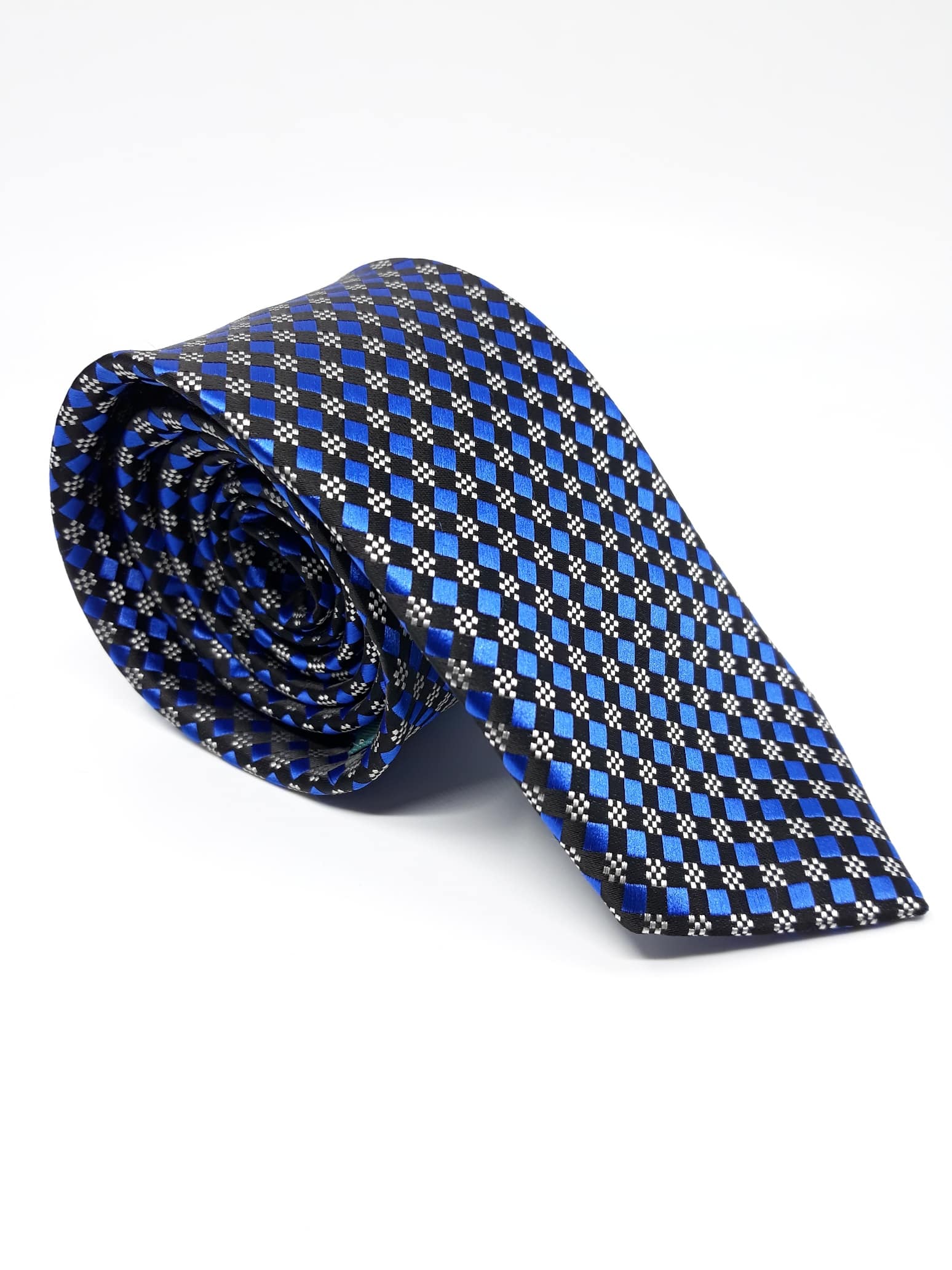 Elegancki krawat męski firmy Piotr o klasycznym i modnym kroju, chabrowo czarny w szachownicę. Krawat o klasycznym i modnym kroju, wykonany ze sztucznego jedwabiu. Jest on bardzo ważnym elementem ubioru, dzięki któremu każdy mężczyzna może wnieść do swojego stroju odrobinę koloru. Kompletując garderobę należy pamiętać, aby krawat tworzył spójny zestaw z marynarką lub koszulą. Jego unikatowy wzór z pewnością spełni swoją funkcję w połączeniu z różnymi tkaninami w kilku wariantach kolorystycznych. Ponadto wyraźne i mocne akcenty zdobnicze dodadzą charakteru i pozwolą wyróżnić się stylem. Krawat można dobrać zarówno do karnacji, garnituru jak i temperamentu.