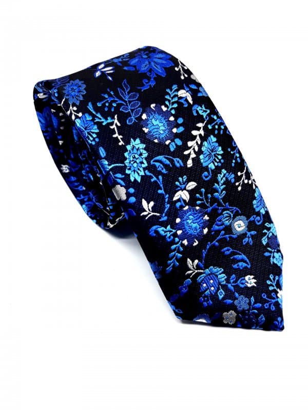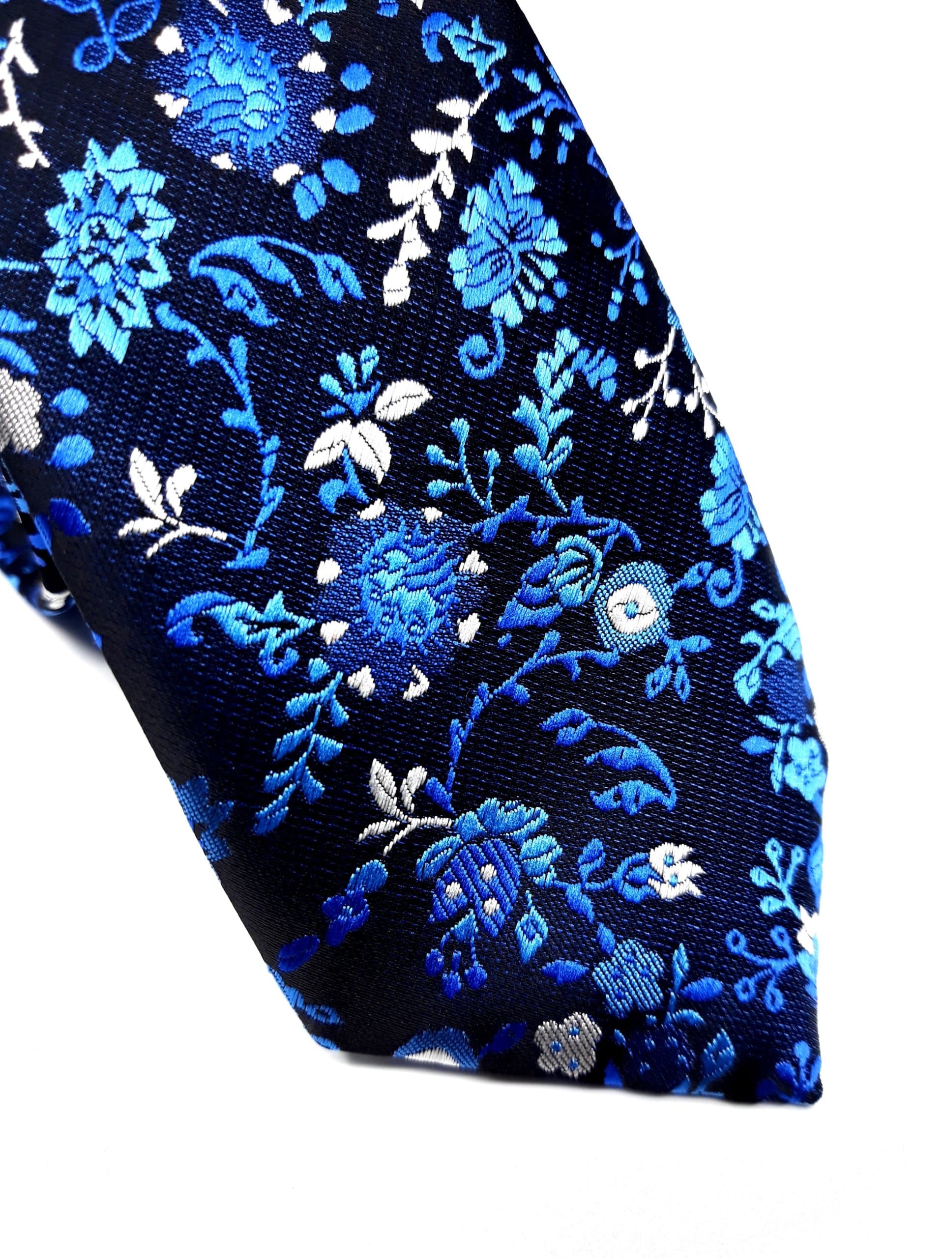 Elegancki Krawat Czarny Kwiatki Szafirowe