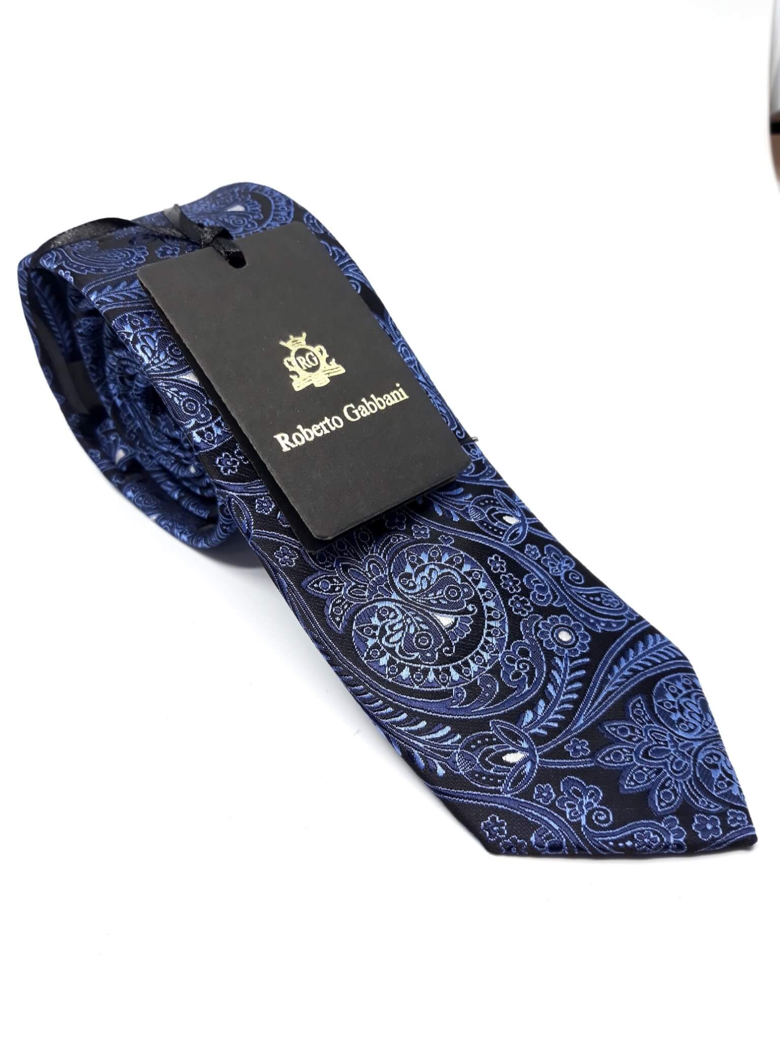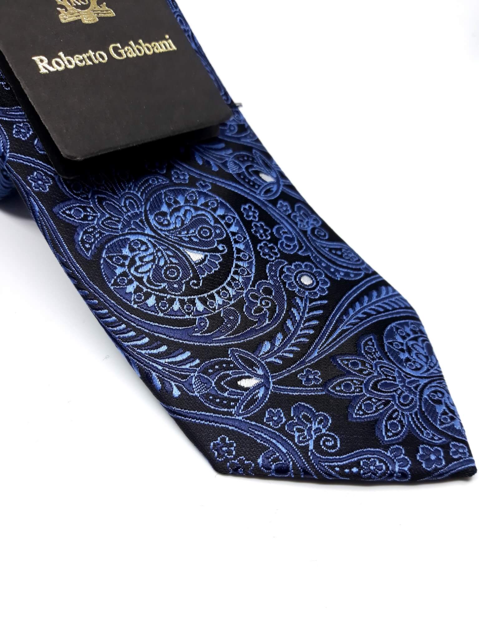 Elegancki krawat męski firmy Roberto-Gabbani o klasycznym i modnym kroju, czarny w niebieski turecki wzór.