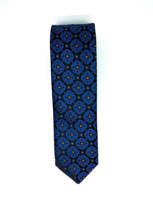 Elegancki krawat męski firmy Piotr o klasycznym i modnym kroju, czarny w kwiatki niebieskie. Wykonany ze sztucznego jedwabiu. Jest on bardzo ważnym elementem ubioru, dzięki któremu każdy mężczyzna może wnieść do swojego stroju odrobinę koloru. Kompletując garderobę należy pamiętać, aby krawat tworzył spójny zestaw z marynarką lub koszulą. Jego unikatowy wzór z pewnością spełni swoją funkcję w połączeniu z różnymi tkaninami w kilku wariantach kolorystycznych. Ponadto wyraźne i mocne akcenty zdobnicze dodadzą charakteru i pozwolą wyróżnić się stylem. Krawat można dobrać zarówno do karnacji, garnituru jak i temperamentu.