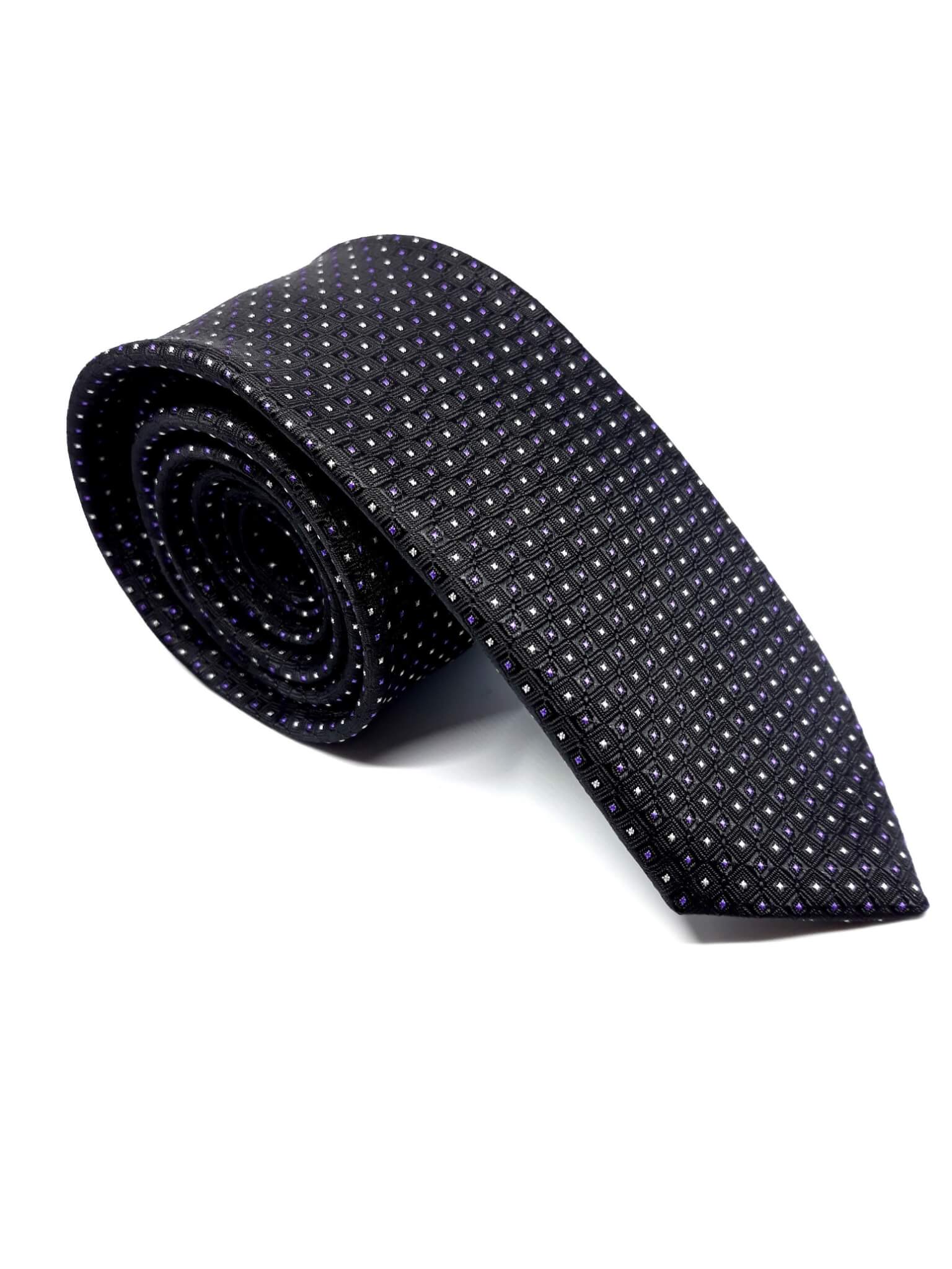 Elegancki krawat męski firmy Piotr o klasycznym i modnym kroju, czarny w białe i fioletowe kropki.Krawat o klasycznym i modnym kroju, wykonany ze sztucznego jedwabiu. Jest on bardzo ważnym elementem ubioru, dzięki któremu każdy mężczyzna może wnieść do swojego stroju odrobinę koloru. Kompletując garderobę należy pamiętać, aby krawat tworzył spójny zestaw z marynarką lub koszulą. Jego unikatowy wzór z pewnością spełni swoją funkcję w połączeniu z różnymi tkaninami w kilku wariantach kolorystycznych. Ponadto wyraźne i mocne akcenty zdobnicze dodadzą charakteru i pozwolą wyróżnić się stylem. Krawat można dobrać zarówno do karnacji, garnituru jak i temperamentu.