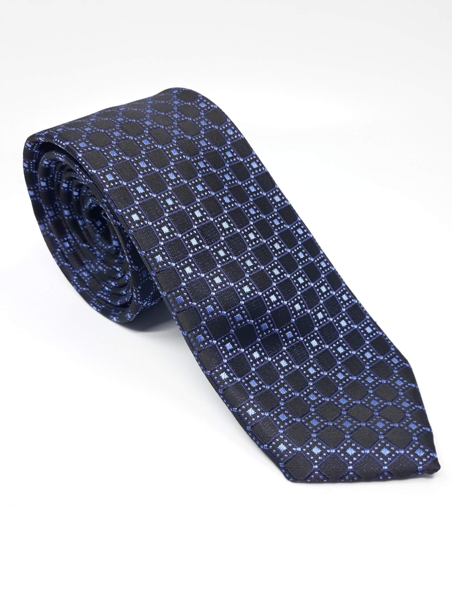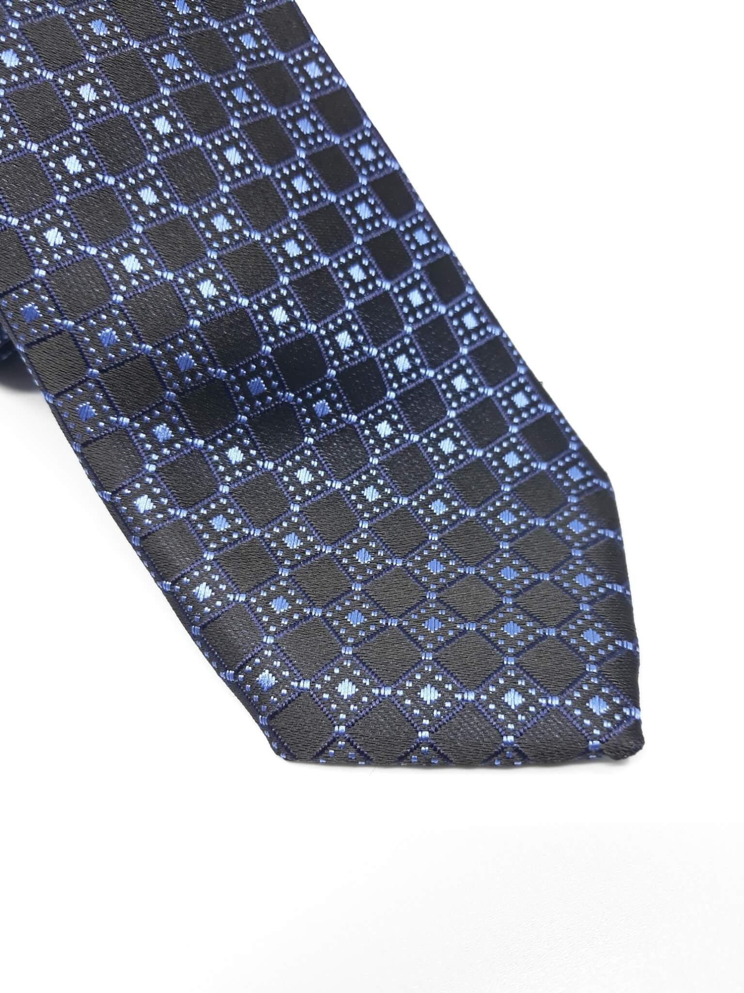 Elegancki krawat męski firmy Piotr o klasycznym i modnym kroju, czarny w niebieskie kwadraty.Krawat o klasycznym i modnym kroju, wykonany ze sztucznego jedwabiu. Jest on bardzo ważnym elementem ubioru, dzięki któremu każdy mężczyzna może wnieść do swojego stroju odrobinę koloru. Kompletując garderobę należy pamiętać, aby krawat tworzył spójny zestaw z marynarką lub koszulą. Jego unikatowy wzór z pewnością spełni swoją funkcję w połączeniu z różnymi tkaninami w kilku wariantach kolorystycznych. Ponadto wyraźne i mocne akcenty zdobnicze dodadzą charakteru i pozwolą wyróżnić się stylem. Krawat można dobrać zarówno do karnacji, garnituru jak i temperamentu.