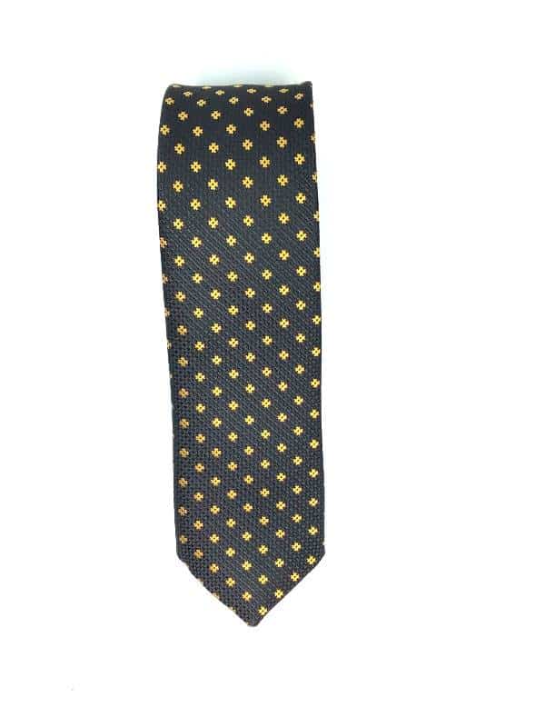 Elegancki krawat męski firmy Piotr o klasycznym i modnym kroju, czarny w żółte płotki. Wykonany ze sztucznego jedwabiu. Jest on bardzo ważnym elementem ubioru, dzięki któremu każdy mężczyzna może wnieść do swojego stroju odrobinę koloru. Kompletując garderobę należy pamiętać, aby krawat tworzył spójny zestaw z marynarką lub koszulą. Jego unikatowy wzór z pewnością spełni swoją funkcję w połączeniu z różnymi tkaninami w kilku wariantach kolorystycznych. Ponadto wyraźne i mocne akcenty zdobnicze dodadzą charakteru i pozwolą wyróżnić się stylem. Krawat można dobrać zarówno do karnacji, garnituru jak i temperamentu.