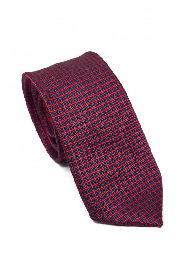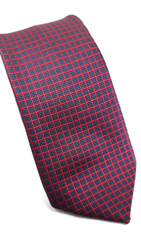 Elegancki krawat męski firmy Piotr o klasycznym i modnym kroju, czerwono granatowy w kratkę. Krawat o klasycznym i modnym kroju, wykonany ze sztucznego jedwabiu. Jest on bardzo ważnym elementem ubioru, dzięki któremu każdy mężczyzna może wnieść do swojego stroju odrobinę koloru. Kompletując garderobę należy pamiętać, aby krawat tworzył spójny zestaw z marynarką lub koszulą. Jego unikatowy wzór z pewnością spełni swoją funkcję w połączeniu z różnymi tkaninami w kilku wariantach kolorystycznych. Ponadto wyraźne i mocne akcenty zdobnicze dodadzą charakteru i pozwolą wyróżnić się stylem. Krawat można dobrać zarówno do karnacji, garnituru jak i temperamentu.