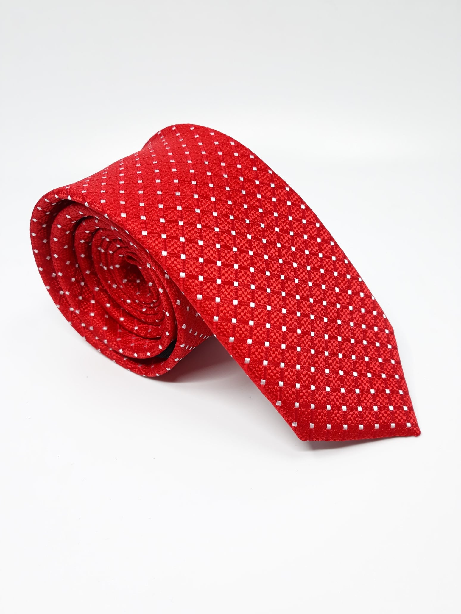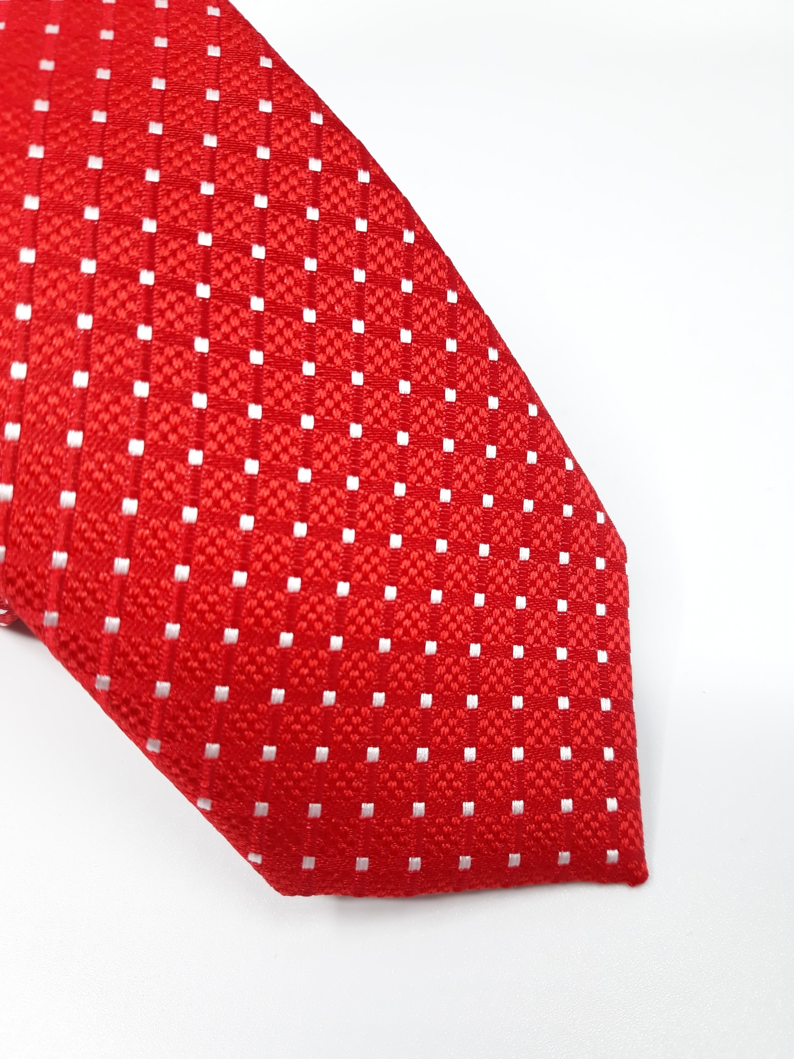 Elegancki krawat męski firmy Piotr o klasycznym i modnym kroju, czerwony w białe kwadraty. Krawat o klasycznym i modnym kroju, wykonany ze sztucznego jedwabiu. Jest on bardzo ważnym elementem ubioru, dzięki któremu każdy mężczyzna może wnieść do swojego stroju odrobinę koloru. Kompletując garderobę należy pamiętać, aby krawat tworzył spójny zestaw z marynarką lub koszulą. Jego unikatowy wzór z pewnością spełni swoją funkcję w połączeniu z różnymi tkaninami w kilku wariantach kolorystycznych. Ponadto wyraźne i mocne akcenty zdobnicze dodadzą charakteru i pozwolą wyróżnić się stylem. Krawat można dobrać zarówno do karnacji, garnituru jak i temperamentu.