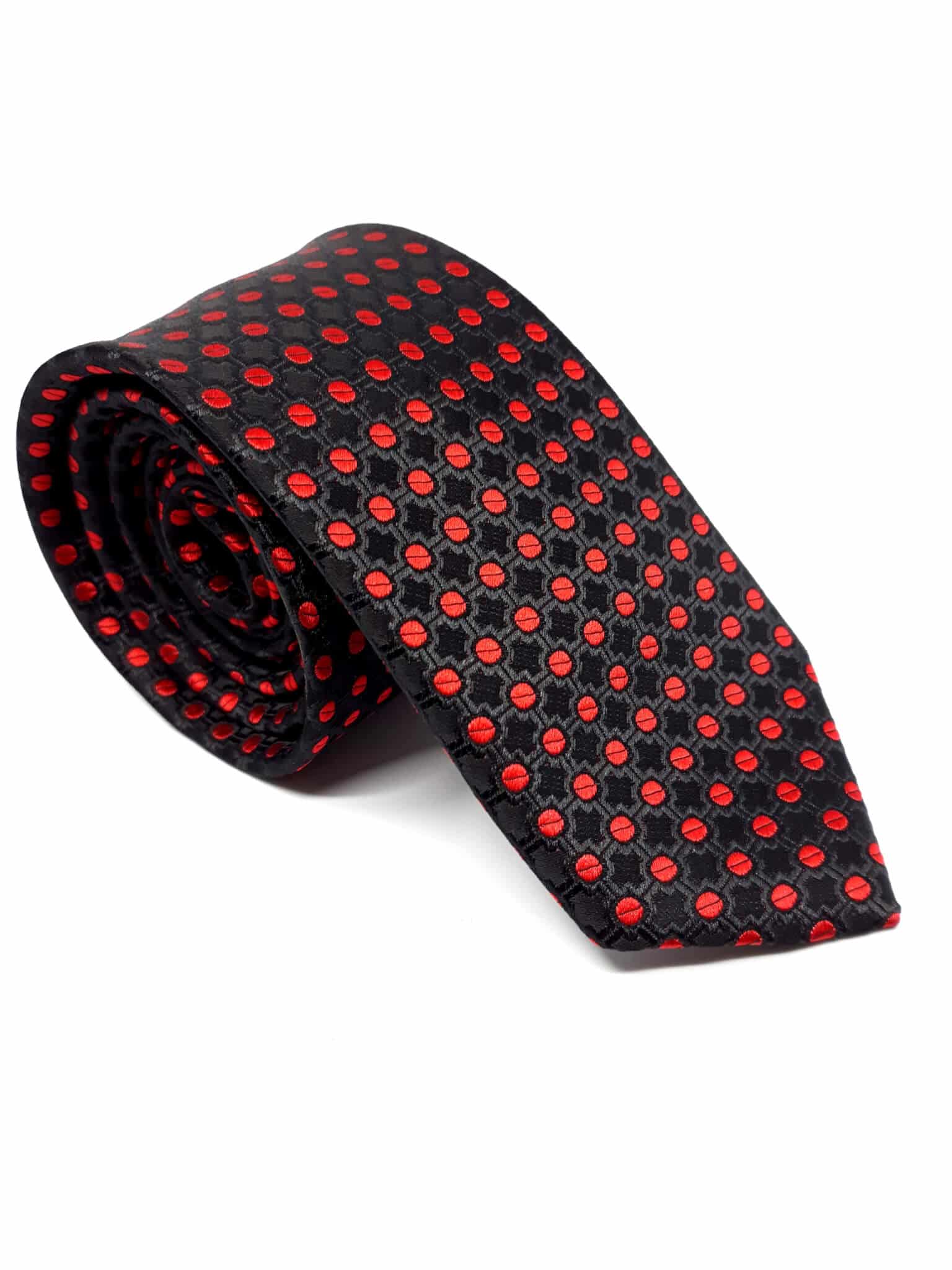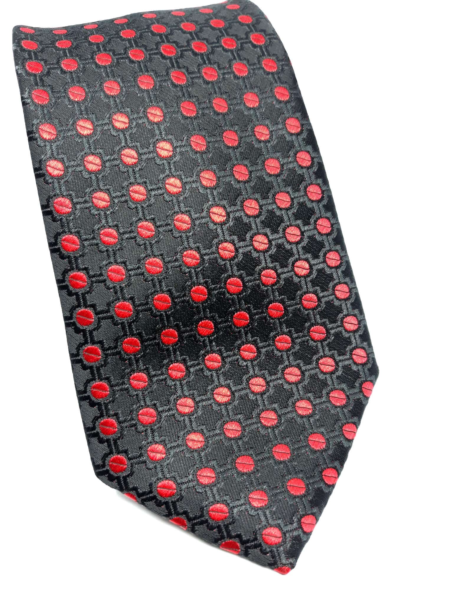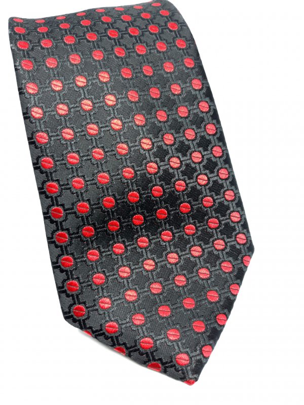 Elegancki krawat męski firmy Roberto Gabbani o klasycznym i modnym kroju, koloru czarnego w czerwone kropki . Jest to ponadczasowy i obowiązkowy element męskiej stylizacji nie tylko odświętnej, w dodatku ten najbardziej wyrazisty. Kompletując garderobę należy pamiętać, aby krawat tworzył spójny zestaw z marynarką lub koszulą. Jego unikatowy wzór z pewnością spełni swoją funkcję w połączeniu z gładkimi tkaninami w kilku wariantach kolorystycznych. Ponadto wyraźne i mocne akcenty zdobnicze dodadzą charakteru i pozwolą wyróżnić się stylem. Krawat ten zdecydowanie będzie też idealnym prezentem dla mężczyzny.