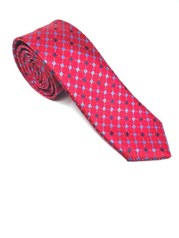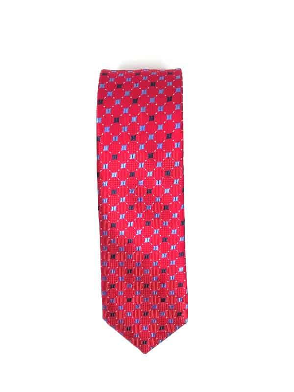 Elegancki krawat męski firmy Piotr o klasycznym i modnym kroju, czerwony w granatowo niebieski wzór. Wykonany ze sztucznego jedwabiu. Jest on bardzo ważnym elementem ubioru, dzięki któremu każdy mężczyzna może wnieść do swojego stroju odrobinę koloru. Kompletując garderobę należy pamiętać, aby krawat tworzył spójny zestaw z marynarką lub koszulą. Jego unikatowy wzór z pewnością spełni swoją funkcję w połączeniu z różnymi tkaninami w kilku wariantach kolorystycznych. Ponadto wyraźne i mocne akcenty zdobnicze dodadzą charakteru i pozwolą wyróżnić się stylem. Krawat można dobrać zarówno do karnacji, garnituru jak i temperamentu.