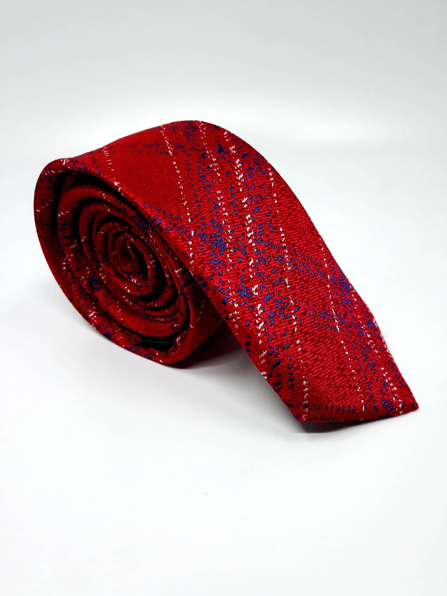 Elegancki krawat męski firmy Roberto Gabbani o klasycznym i modnym kroju, czerwony w niebiesko białe przeszycia. Krawat o klasycznym i modnym kroju, wykonany ze sztucznego jedwabiu. Jest on bardzo ważnym elementem ubioru, dzięki któremu każdy mężczyzna może wnieść do swojego stroju odrobinę koloru. Kompletując garderobę należy pamiętać, aby krawat tworzył spójny zestaw z marynarką lub koszulą. Jego unikatowy wzór z pewnością spełni swoją funkcję w połączeniu z różnymi tkaninami w kilku wariantach kolorystycznych. Ponadto wyraźne i mocne akcenty zdobnicze dodadzą charakteru i pozwolą wyróżnić się stylem. Krawat można dobrać zarówno do karnacji, garnituru jak i temperamentu.