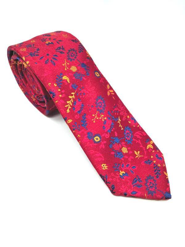 Elegancki krawat męski firmy Piotr o klasycznym i modnym kroju, czerwony w niebiesko żółty wzór. Krawat o klasycznym i modnym kroju, wykonany ze sztucznego jedwabiu. Jest on bardzo ważnym elementem ubioru, dzięki któremu każdy mężczyzna może wnieść do swojego stroju odrobinę koloru. Kompletując garderobę należy pamiętać, aby krawat tworzył spójny zestaw z marynarką lub koszulą. Jego unikatowy wzór z pewnością spełni swoją funkcję w połączeniu z różnymi tkaninami w kilku wariantach kolorystycznych. Ponadto wyraźne i mocne akcenty zdobnicze dodadzą charakteru i pozwolą wyróżnić się stylem. Krawat można dobrać zarówno do karnacji, garnituru jak i temperamentu.