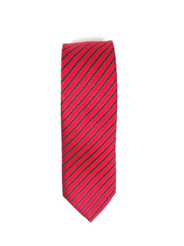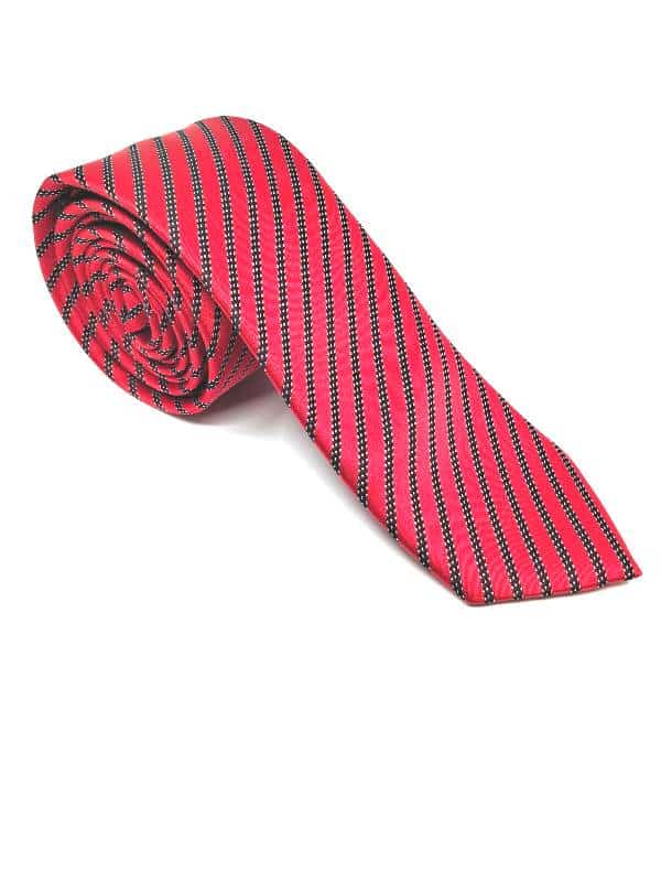 Elegancki krawat męski firmy Piotr o klasycznym i modnym kroju, czerwony w paski czarne. Wykonany ze sztucznego jedwabiu. Jest on bardzo ważnym elementem ubioru, dzięki któremu każdy mężczyzna może wnieść do swojego stroju odrobinę koloru. Kompletując garderobę należy pamiętać, aby krawat tworzył spójny zestaw z marynarką lub koszulą. Jego unikatowy wzór z pewnością spełni swoją funkcję w połączeniu z różnymi tkaninami w kilku wariantach kolorystycznych. Ponadto wyraźne i mocne akcenty zdobnicze dodadzą charakteru i pozwolą wyróżnić się stylem. Krawat można dobrać zarówno do karnacji, garnituru jak i temperamentu.