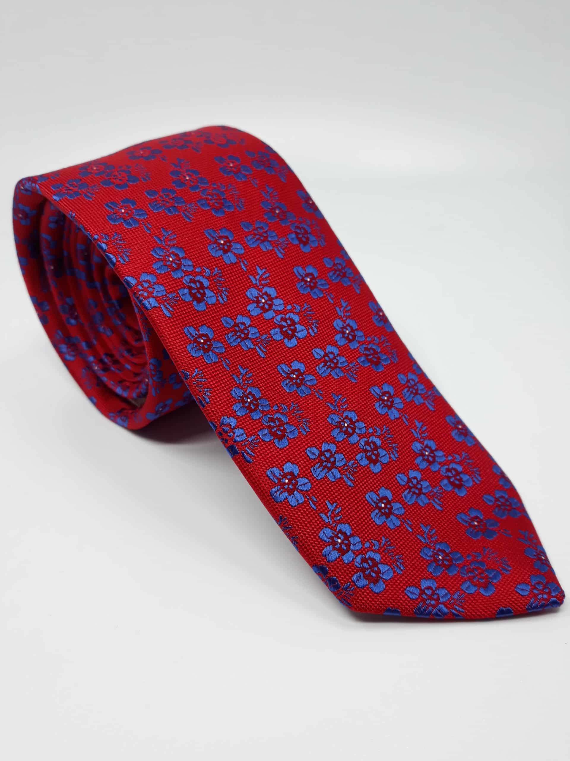 Elegancki krawat męski firmy Piotr o klasycznym i modnym kroju, czerwony w w szafirowe kwiatuszki.