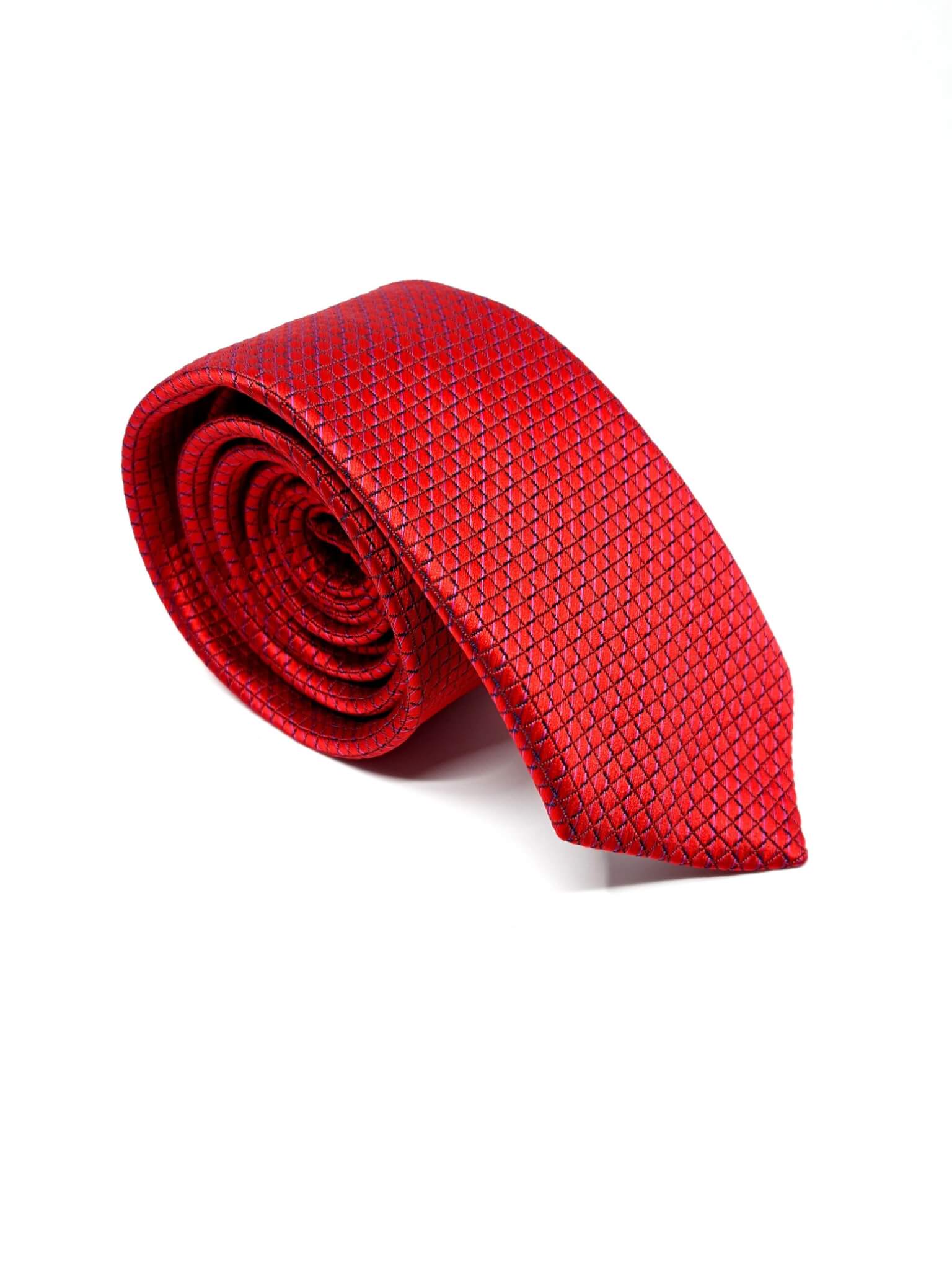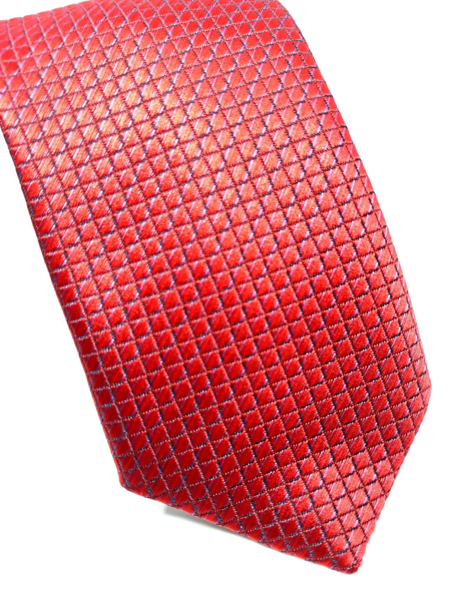 Elegancki krawat męski firmy Piotr o klasycznym i modnym kroju, czerwony w tłoczoną kratkę. Krawat o klasycznym i modnym kroju, wykonany ze sztucznego jedwabiu. Jest on bardzo ważnym elementem ubioru, dzięki któremu każdy mężczyzna może wnieść do swojego stroju odrobinę koloru. Kompletując garderobę należy pamiętać, aby krawat tworzył spójny zestaw z marynarką lub koszulą. Jego unikatowy wzór z pewnością spełni swoją funkcję w połączeniu z różnymi tkaninami w kilku wariantach kolorystycznych. Ponadto wyraźne i mocne akcenty zdobnicze dodadzą charakteru i pozwolą wyróżnić się stylem. Krawat można dobrać zarówno do karnacji, garnituru jak i temperamentu.
