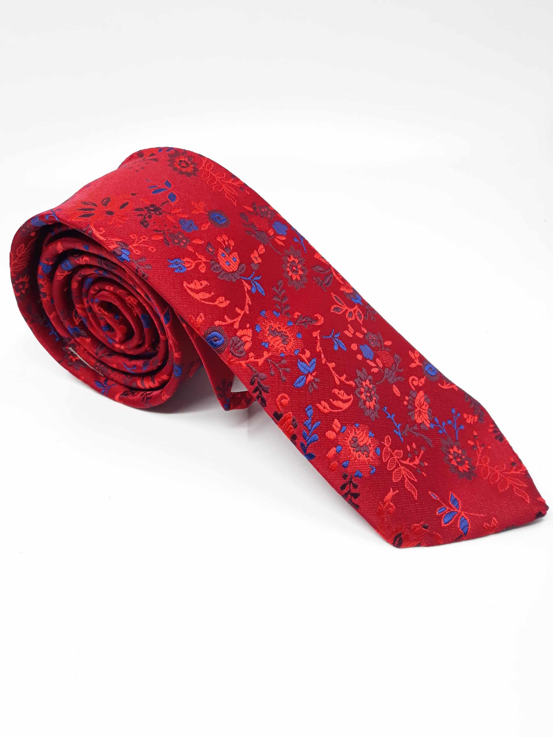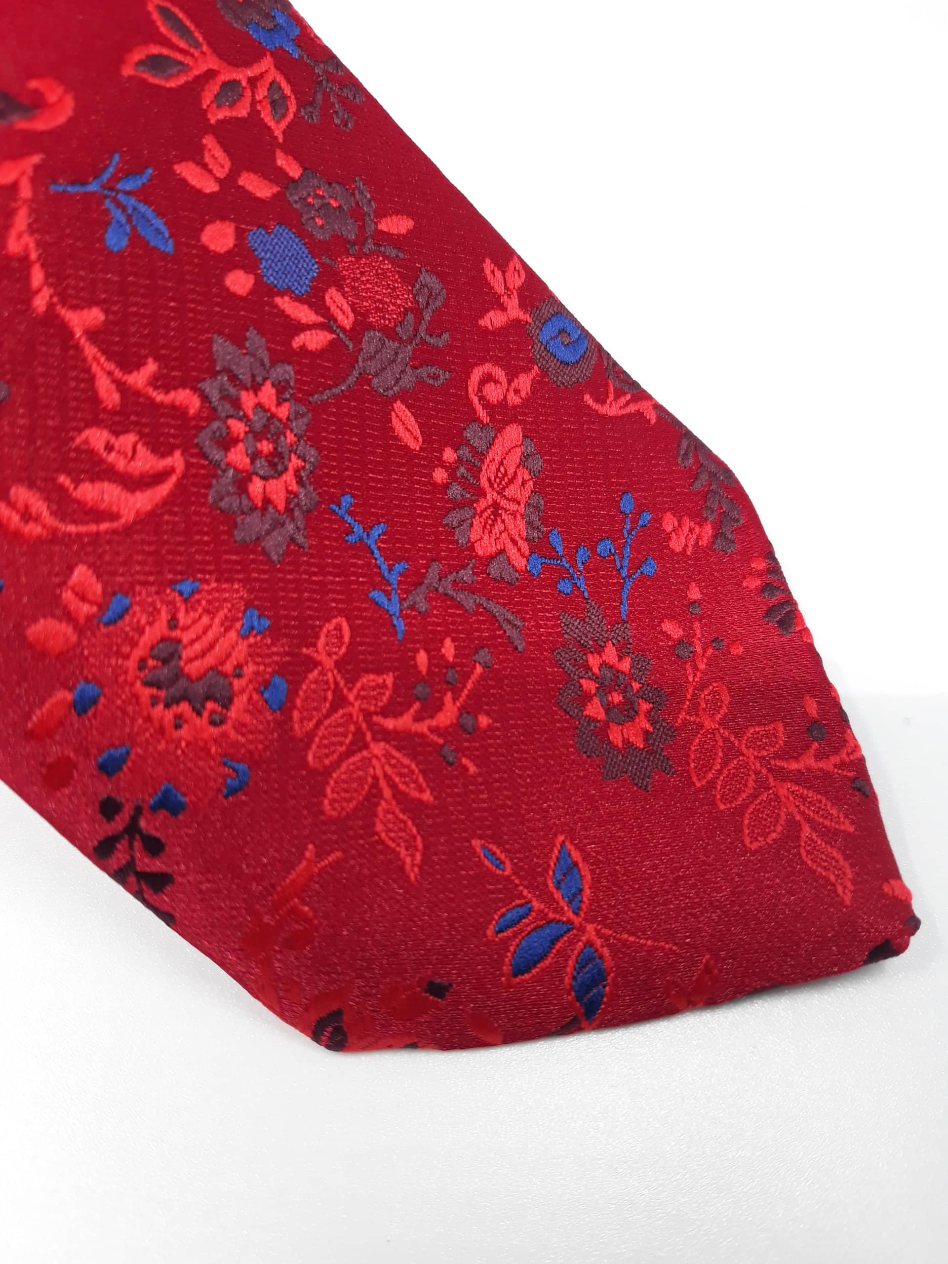 Elegancki krawat męski firmy Piotr o klasycznym i modnym kroju, czerwony w tłoczone kwiaty.