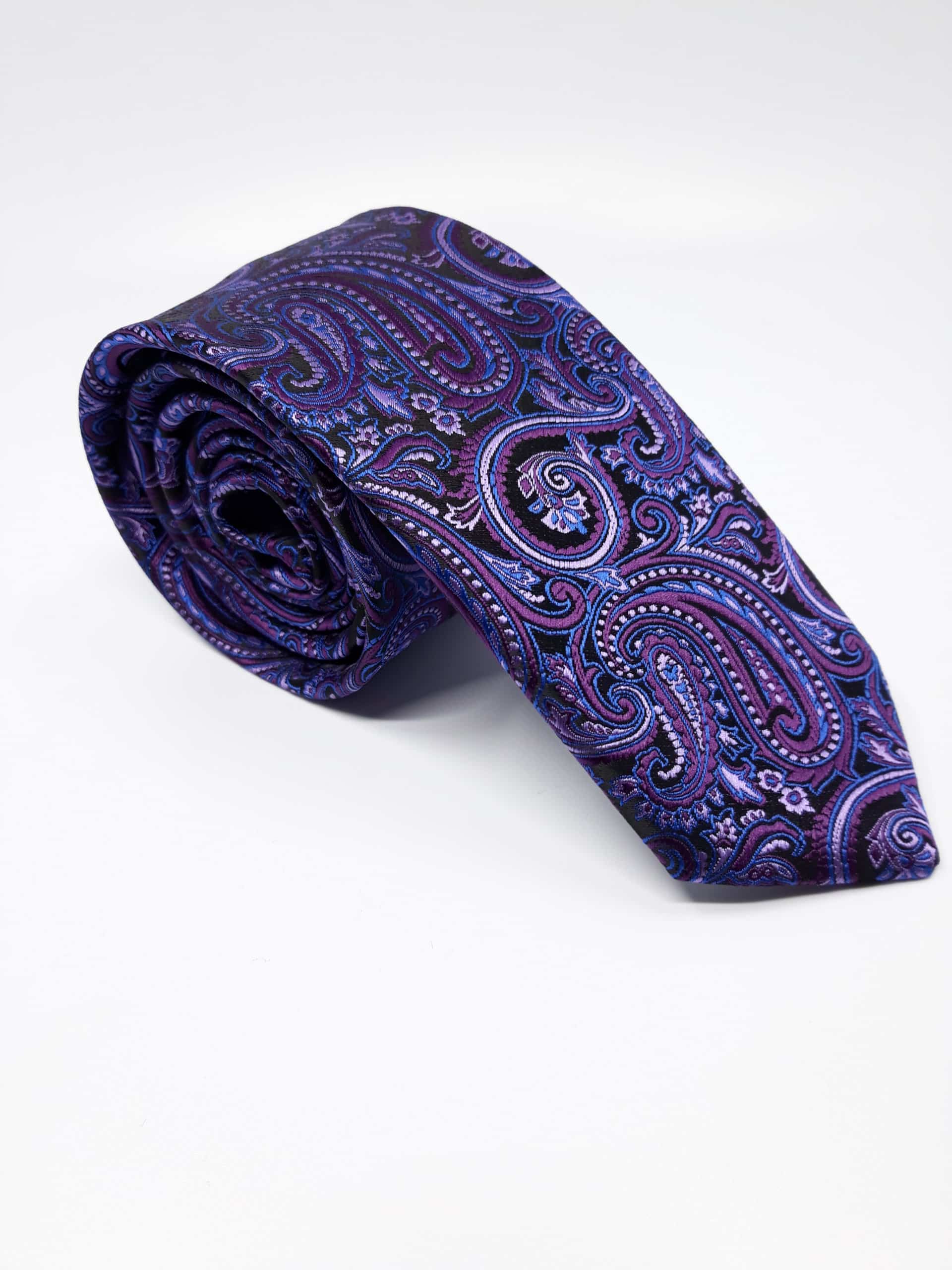 Elegancki krawat męski firmy Piotr o klasycznym i modnym kroju, fioletowy we wzór turecki.