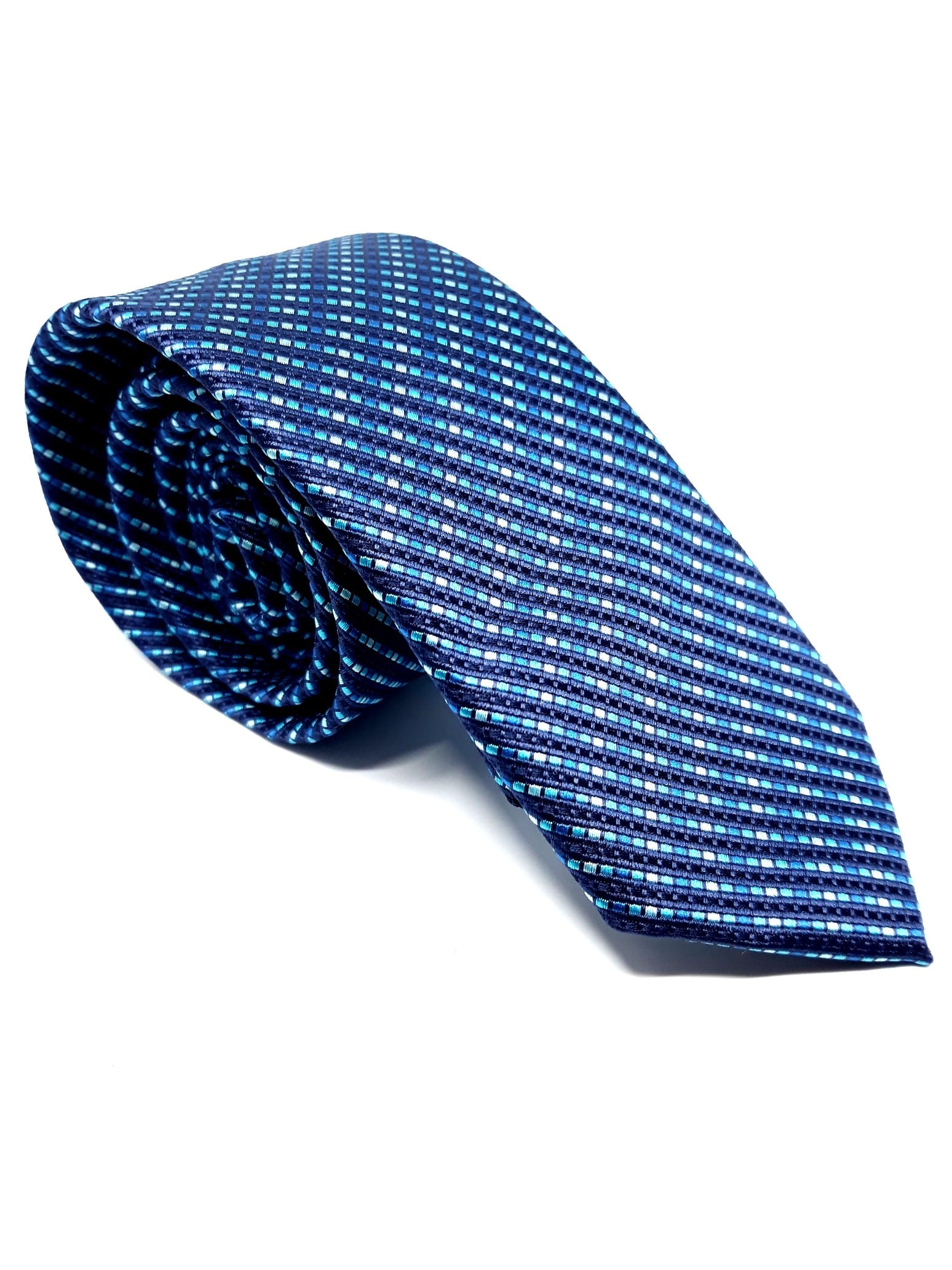 Elegancki krawat męski firmy Piotr o klasycznym i modnym kroju, granatowo niebieski w prostokąty. Krawat o klasycznym i modnym kroju, wykonany ze sztucznego jedwabiu. Jest on bardzo ważnym elementem ubioru, dzięki któremu każdy mężczyzna może wnieść do swojego stroju odrobinę koloru. Kompletując garderobę należy pamiętać, aby krawat tworzył spójny zestaw z marynarką lub koszulą. Jego unikatowy wzór z pewnością spełni swoją funkcję w połączeniu z różnymi tkaninami w kilku wariantach kolorystycznych. Ponadto wyraźne i mocne akcenty zdobnicze dodadzą charakteru i pozwolą wyróżnić się stylem. Krawat można dobrać zarówno do karnacji, garnituru jak i temperamentu.