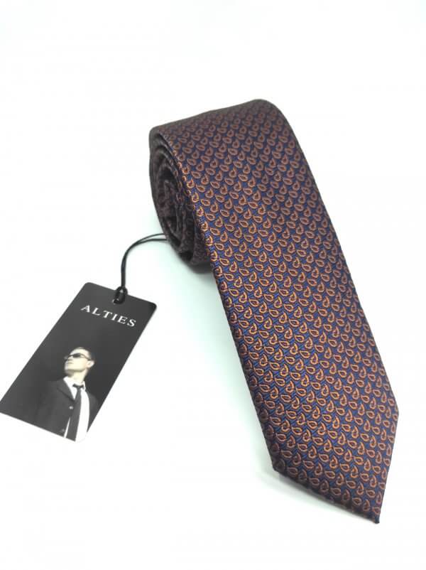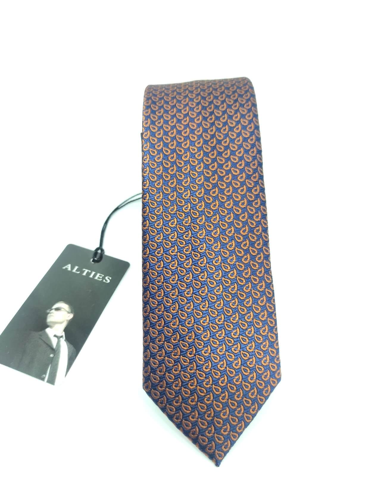 Elegancki krawat męski firmy Alties o klasycznym i modnym kroju,granatowy w brązowe łezki. Krawat o klasycznym i modnym kroju, wykonany z microfibry. Jest on bardzo ważnym elementem ubioru, dzięki któremu każdy mężczyzna może wnieść do swojego stroju odrobinę koloru. Kompletując garderobę należy pamiętać, aby krawat tworzył spójny zestaw z marynarką lub koszulą. Jego unikatowy wzór z pewnością spełni swoją funkcję w połączeniu z różnymi tkaninami w kilku wariantach kolorystycznych. Ponadto wyraźne i mocne akcenty zdobnicze dodadzą charakteru i pozwolą wyróżnić się stylem. Krawat można dobrać zarówno do karnacji, garnituru jak i temperamentu.