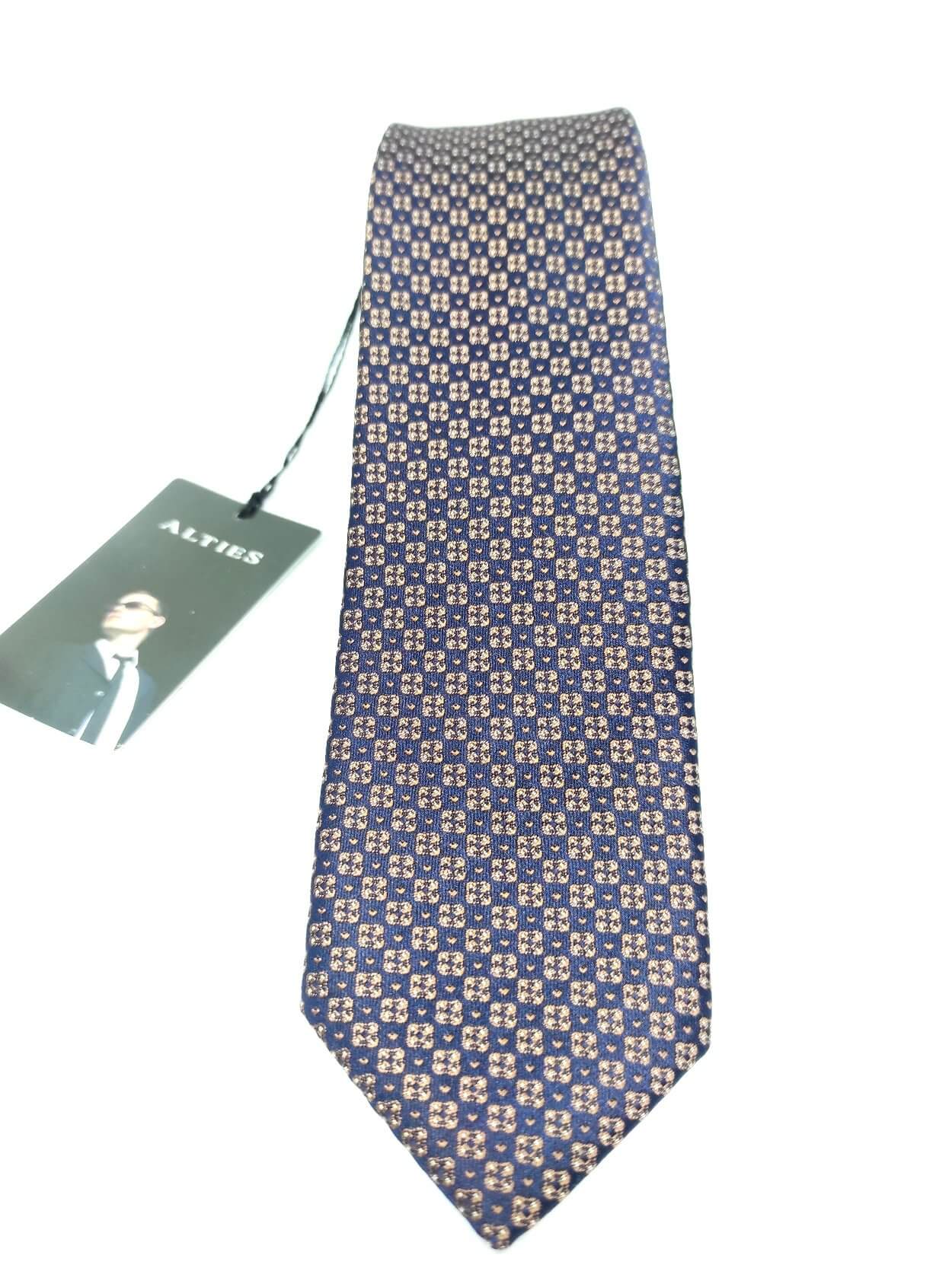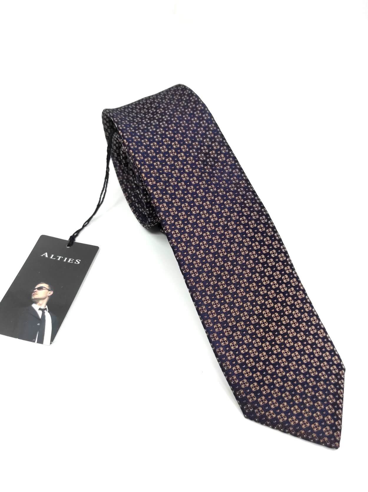 Elegancki krawat męski firmy Alties o klasycznym i modnym kroju,granatowy w brązowy wzór. Krawat o klasycznym i modnym kroju, wykonany z microfibry. Jest on bardzo ważnym elementem ubioru, dzięki któremu każdy mężczyzna może wnieść do swojego stroju odrobinę koloru. Kompletując garderobę należy pamiętać, aby krawat tworzył spójny zestaw z marynarką lub koszulą. Jego unikatowy wzór z pewnością spełni swoją funkcję w połączeniu z różnymi tkaninami w kilku wariantach kolorystycznych. Ponadto wyraźne i mocne akcenty zdobnicze dodadzą charakteru i pozwolą wyróżnić się stylem. Krawat można dobrać zarówno do karnacji, garnituru jak i temperamentu.