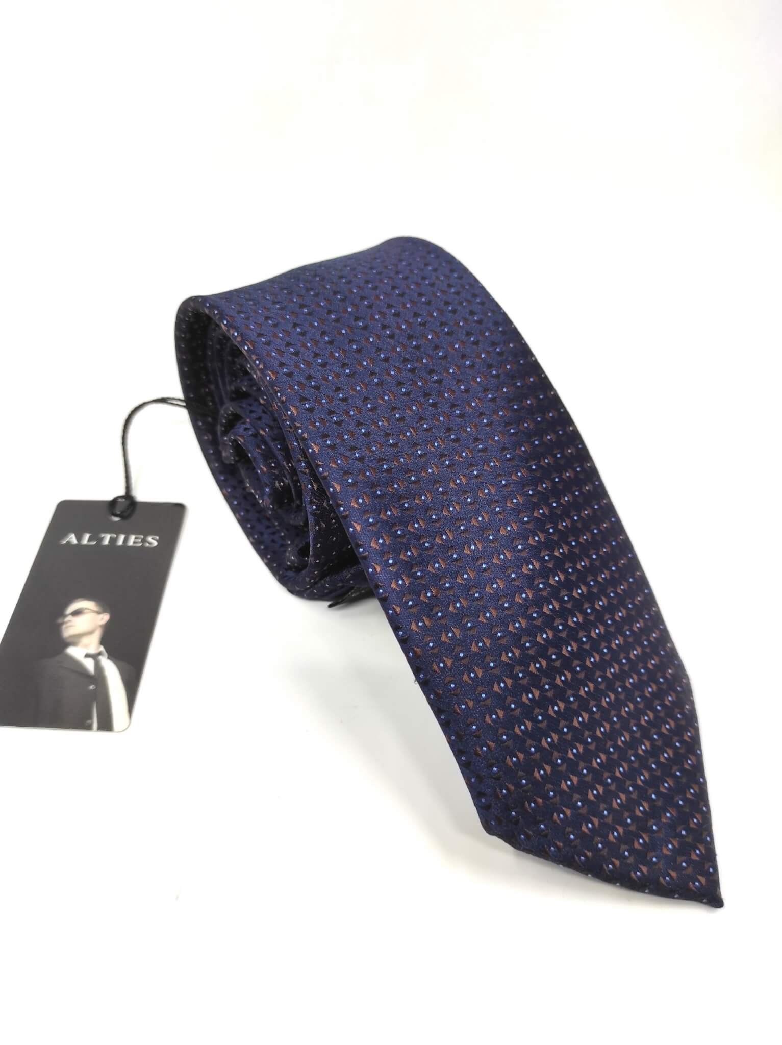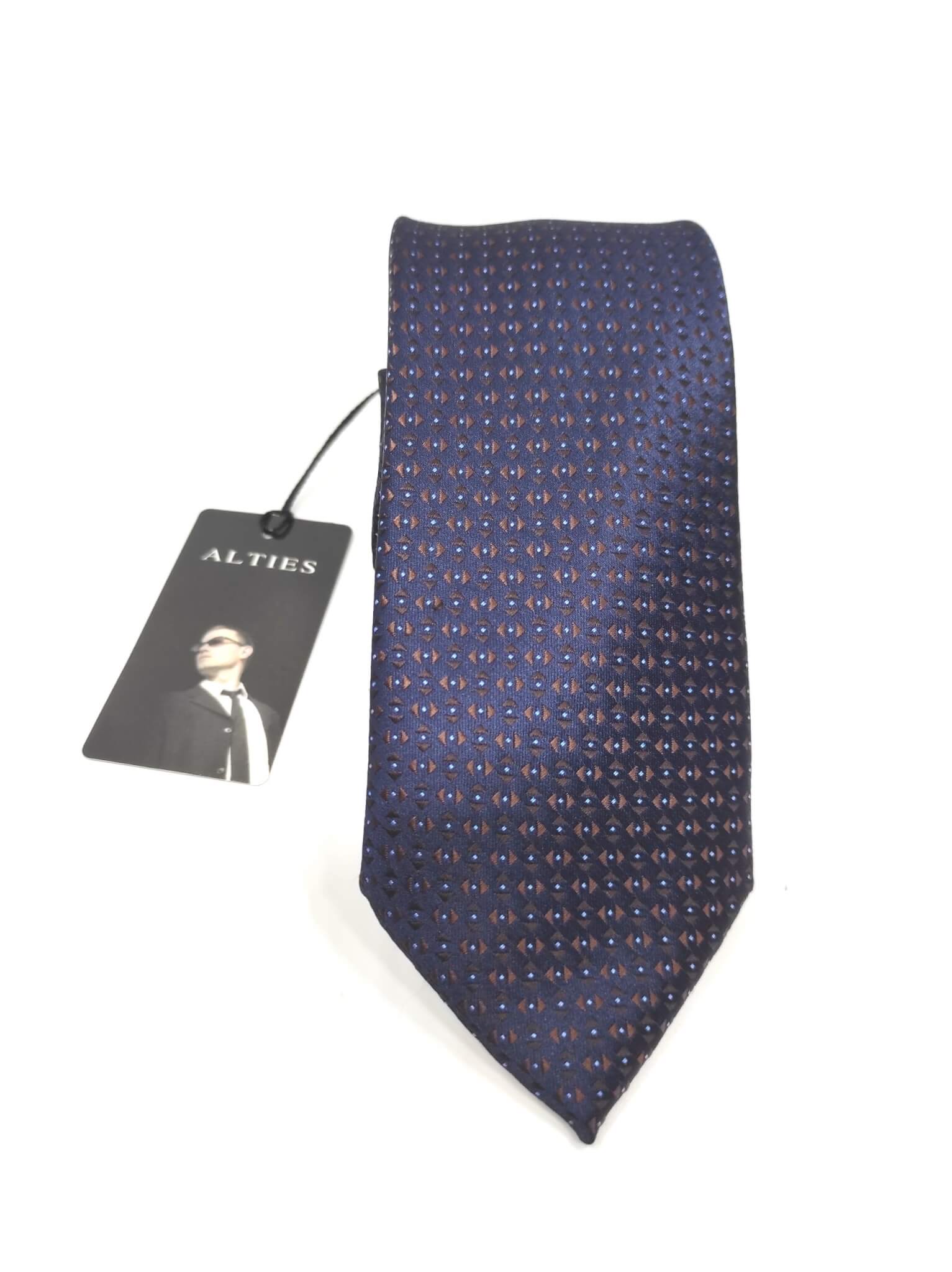 Elegancki krawat męski firmy Alties o klasycznym i modnym kroju,granatowy w brązowy wzorek. Krawat o klasycznym i modnym kroju, wykonany z microfibry. Jest on bardzo ważnym elementem ubioru, dzięki któremu każdy mężczyzna może wnieść do swojego stroju odrobinę koloru. Kompletując garderobę należy pamiętać, aby krawat tworzył spójny zestaw z marynarką lub koszulą. Jego unikatowy wzór z pewnością spełni swoją funkcję w połączeniu z różnymi tkaninami w kilku wariantach kolorystycznych. Ponadto wyraźne i mocne akcenty zdobnicze dodadzą charakteru i pozwolą wyróżnić się stylem. Krawat można dobrać zarówno do karnacji, garnituru jak i temperamentu.