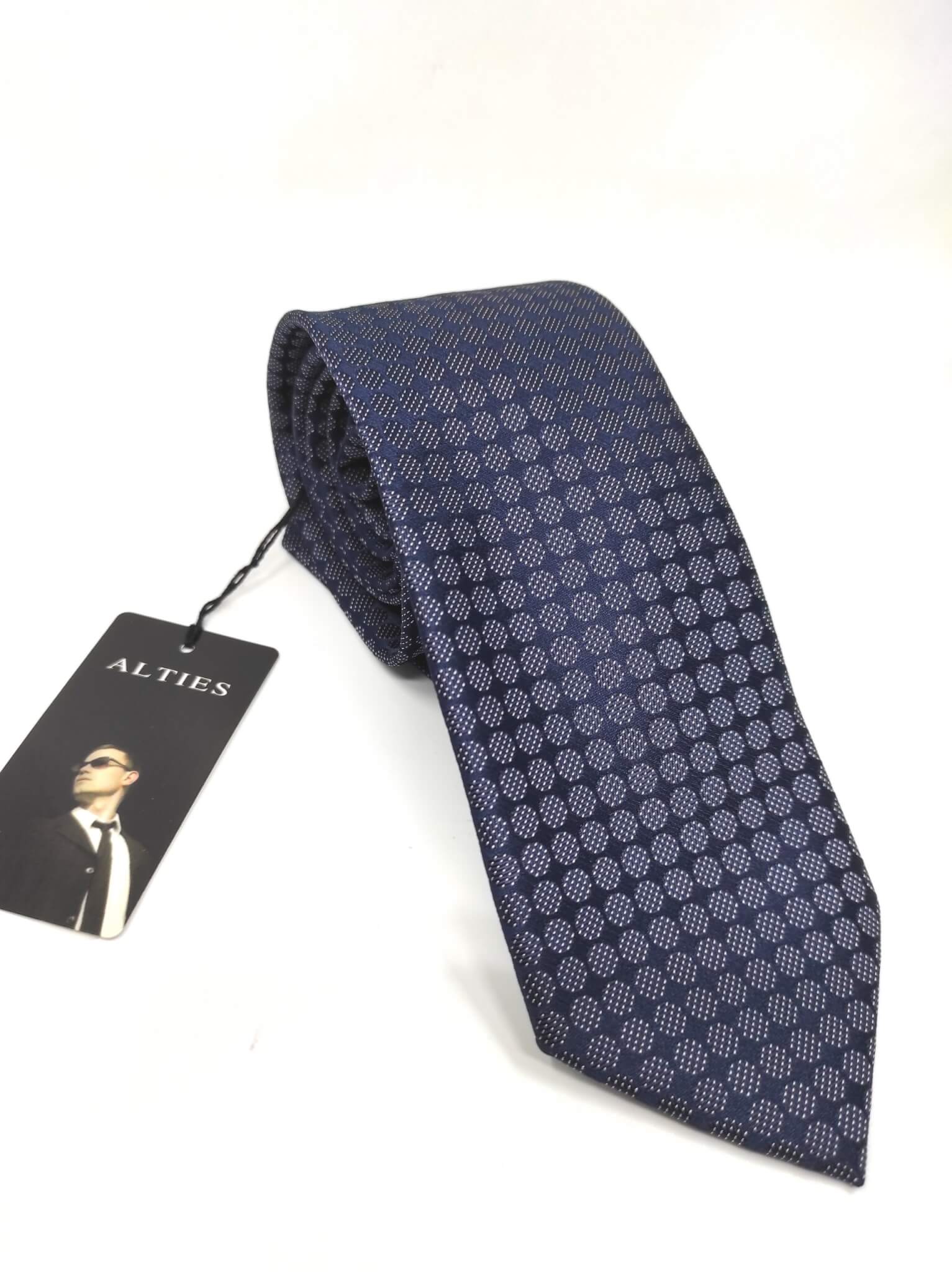 Elegancki krawat męski firmy Alties o klasycznym i modnym kroju,granatowy w białe kółka. Krawat o klasycznym i modnym kroju, wykonany z microfibry. Jest on bardzo ważnym elementem ubioru, dzięki któremu każdy mężczyzna może wnieść do swojego stroju odrobinę koloru. Kompletując garderobę należy pamiętać, aby krawat tworzył spójny zestaw z marynarką lub koszulą. Jego unikatowy wzór z pewnością spełni swoją funkcję w połączeniu z różnymi tkaninami w kilku wariantach kolorystycznych. Ponadto wyraźne i mocne akcenty zdobnicze dodadzą charakteru i pozwolą wyróżnić się stylem. Krawat można dobrać zarówno do karnacji, garnituru jak i temperamentu.