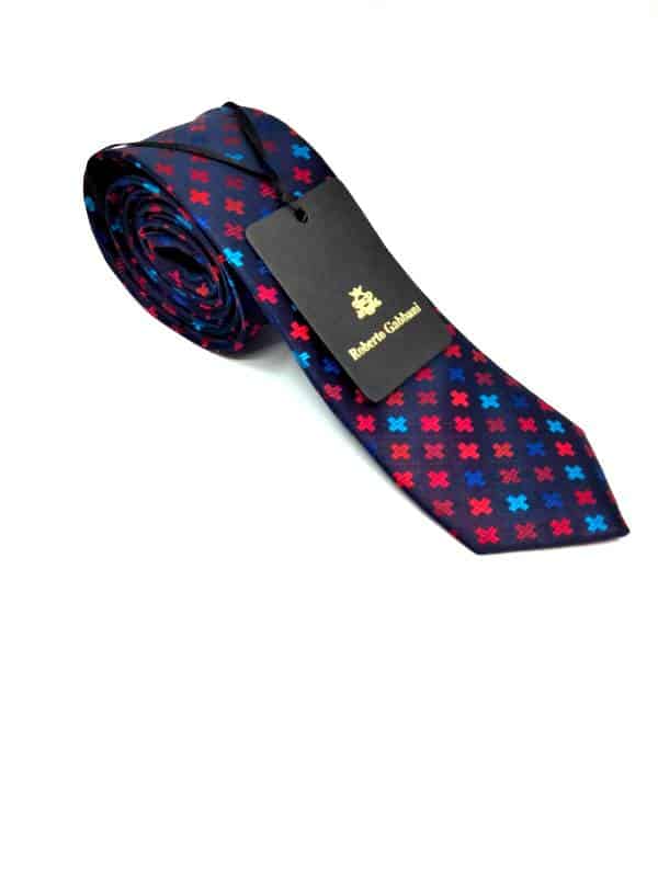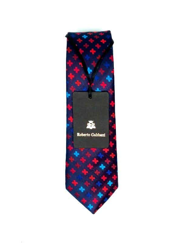 Elegancki krawat męski firmy Roberto Gabbani o klasycznym i modnym kroju, granatowy w krzyżyki. Wykonany ze sztucznego jedwabiu. Jest on bardzo ważnym elementem ubioru, dzięki któremu każdy mężczyzna może wnieść do swojego stroju odrobinę koloru. Kompletując garderobę należy pamiętać, aby krawat tworzył spójny zestaw z marynarką lub koszulą. Jego unikatowy wzór z pewnością spełni swoją funkcję w połączeniu z różnymi tkaninami w kilku wariantach kolorystycznych. Ponadto wyraźne i mocne akcenty zdobnicze dodadzą charakteru i pozwolą wyróżnić się stylem. Krawat można dobrać zarówno do karnacji, garnituru jak i temperamentu.
