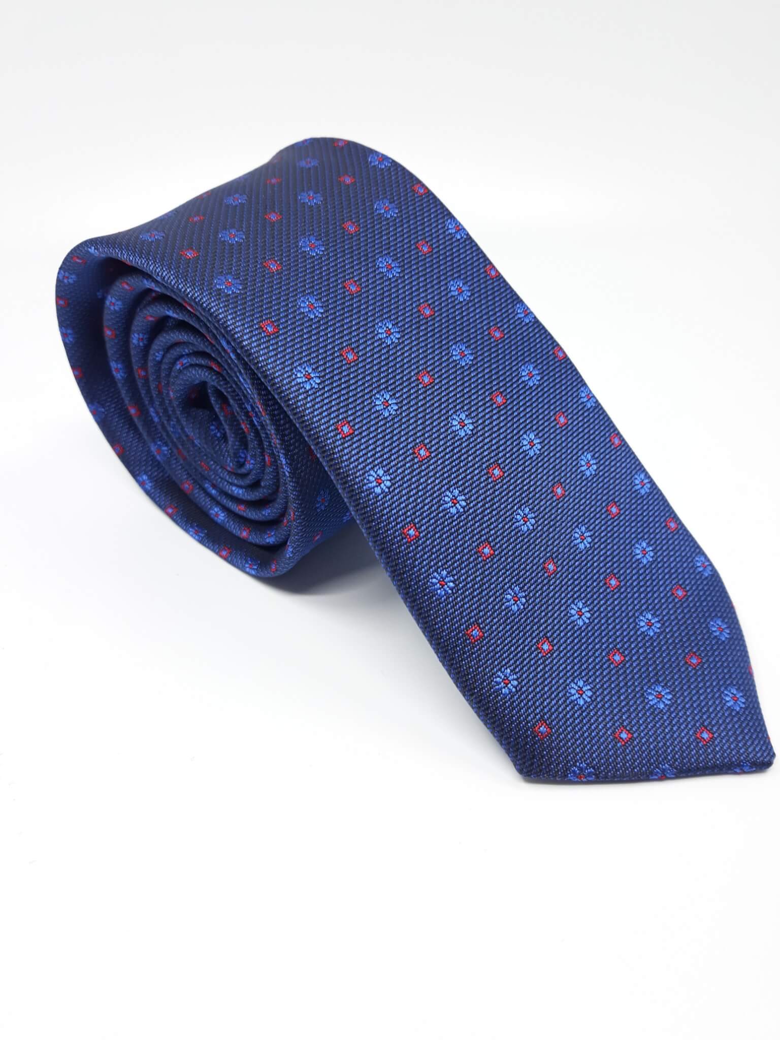 Elegancki krawat męski firmy Piotr o klasycznym i modnym kroju, granatowy w drobne kwiatuszki niebieskie i czerwone kwadraciki. Krawat o klasycznym i modnym kroju, wykonany ze sztucznego jedwabiu. Jest on bardzo ważnym elementem ubioru, dzięki któremu każdy mężczyzna może wnieść do swojego stroju odrobinę koloru. Kompletując garderobę należy pamiętać, aby krawat tworzył spójny zestaw z marynarką lub koszulą. Jego unikatowy wzór z pewnością spełni swoją funkcję w połączeniu z różnymi tkaninami w kilku wariantach kolorystycznych. Ponadto wyraźne i mocne akcenty zdobnicze dodadzą charakteru i pozwolą wyróżnić się stylem. Krawat można dobrać zarówno do karnacji, garnituru jak i temperamentu.